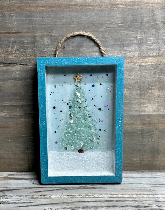 Coastal Crushed Glass Christmas Tree Wallhanging-5x5" Christmas Ornament-Tree on a Beach-Mantel Piece-Tabletop Art-Boho Christmas-Hand Made
