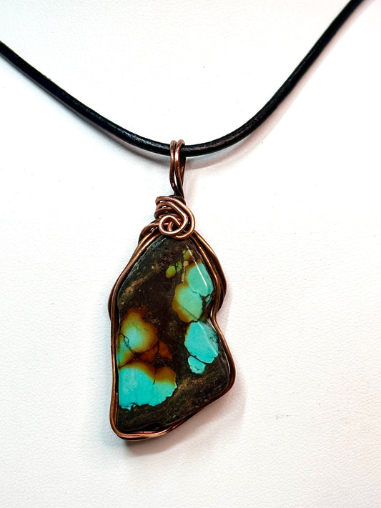 Beautiful Freeform Turquoise Slice & Solid Copper Wire Framed Necklace-Adjustable Length Black Leather Cord-Perfect Valentines Gift-Unisex