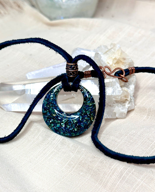 Boho Gypsy Hoop Pendant-Shimmering Ocean Blue/Green Crushed Glass Focal Pendant-Copper Accents-Genuine Suede Leather Cord w/Hook Closure