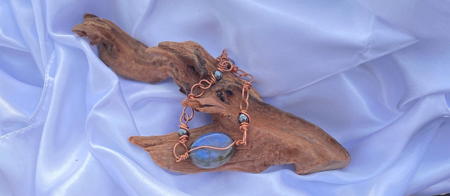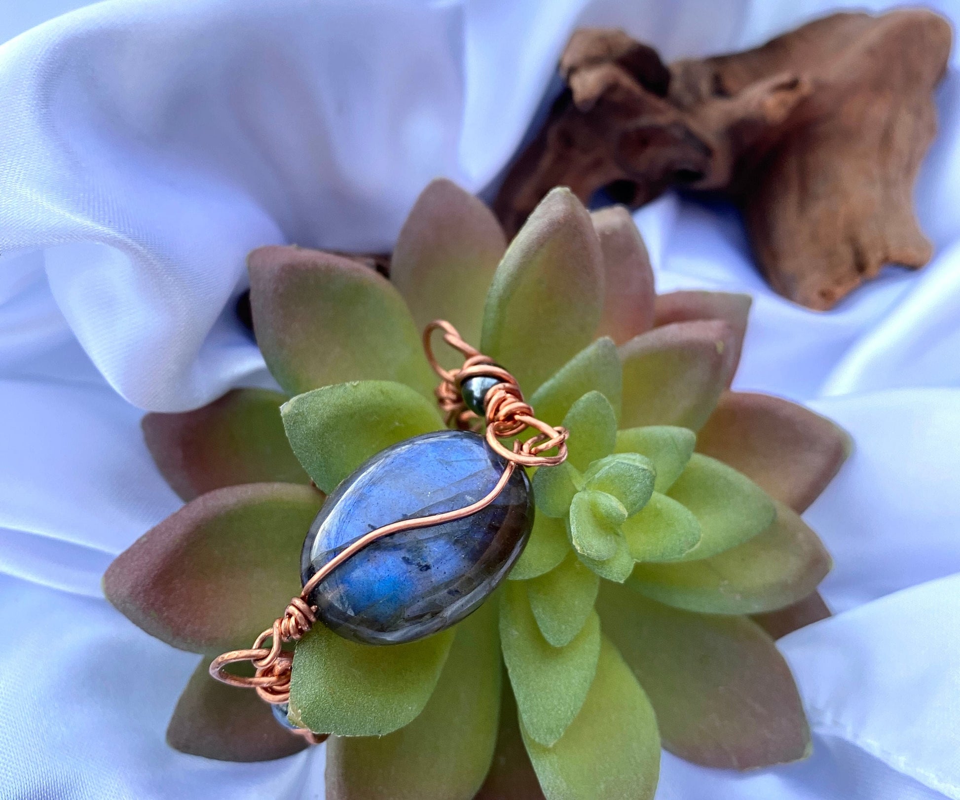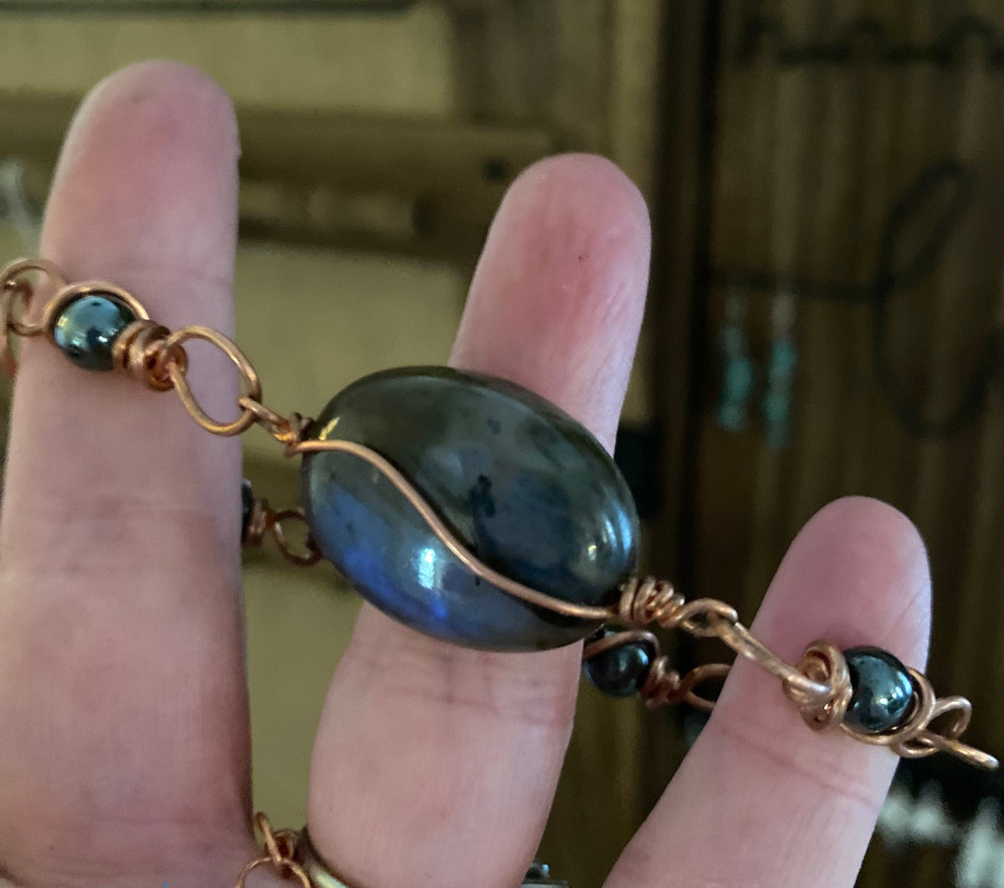 This bracelet is Boho and it is somewhat minimalist as well. The focal is a dreamy deep blue, approximately 1” long Labradorite with simple curved wire wrapped line. The beads creating the bracelet are 8mm hematite. The copper wrapping has been slightly darkened to a gorgeous patina with a few bright copper highlights.