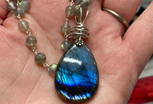 Flashy Blue Labradorite Wire Wrapped Necklace with Grey Labradorite Beaded Silver chain