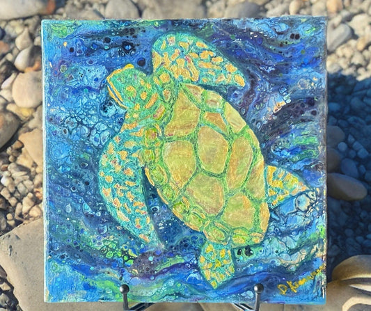 Fluid Art Sea Turtle Painting-Mixed Media Colorful Turtle on 8x8 Wood Canvas Drawing-Metallic Acrylic Paints and Resin Sealed