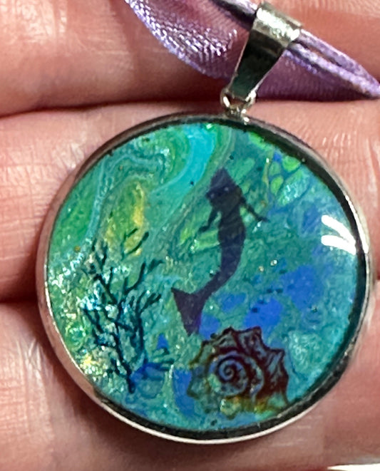 Mermaid Resin Necklace, Ocean Nautical Stainless Steel or Wood Bezel Sea Life Pendant, Girls, Boys, Women, Paint Skin Jewelry, Handmade USA