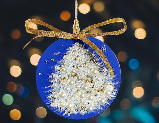 Hand Painted Blue Gold & Pearl 4" Disc Christmas Tree or Mantle Ornament-Rustic Farmhouse Holiday Decor-Perfect Housewarming Gift