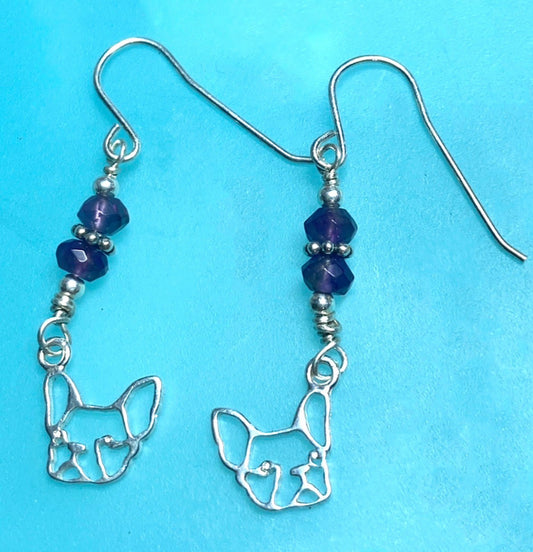 French Bulldog Earrings-.925 Sterling Silver Frenchie Dangles-Vintage Genuine Amethyst Bead Gemstone Jewelry-Handmade in the USA