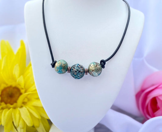 Minimalist Boho Blue Patina Brass Balls and Black Knotted Leather Cord Necklace-14mm Decorative Vintage Recycled Brass Ball Beads Choker