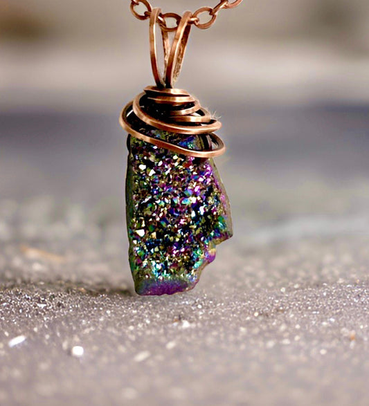 Electroplated Crystal Druzy and Solid Copper Necklace-Hand Crafted-Healing Wrapped Oxydized 99.99% Solid Copper, Recycled Materials-Unisex