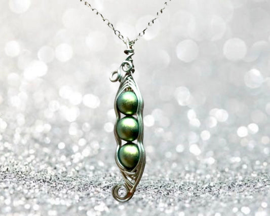 Family Pea Pod Necklace-6mm Green Gold Swarovski Crystal "Pearls"-Sterling Silver Wire Wrapped-MOM gift-Grandmother-Push Gift-Best Friends