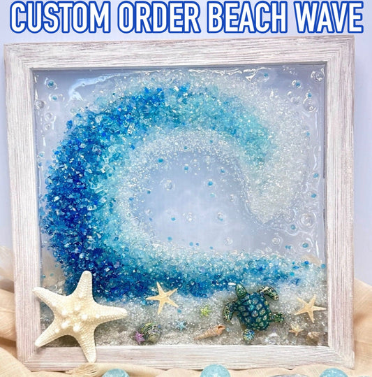 CUSTOM ORDER 9x9” Crushed Glass Framed Beach Wave Resin Wall Hanging, Sand, Shells, and Starfish Nautical Art, Handmade Coastal, USA Made