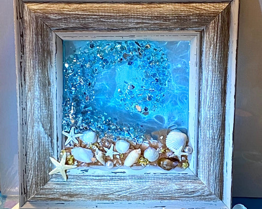 Small 6x6” Framed Crushed Glass Beach Wave Picture-Mixed Media Art-Coastal Art