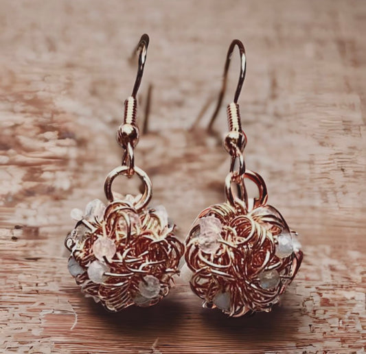 Raw Solid Copper & Moonstone Dangle Earrings-Tangled Coiled Balls-Twisted Balled Minimalist BoHo Style-Handmade in the USA