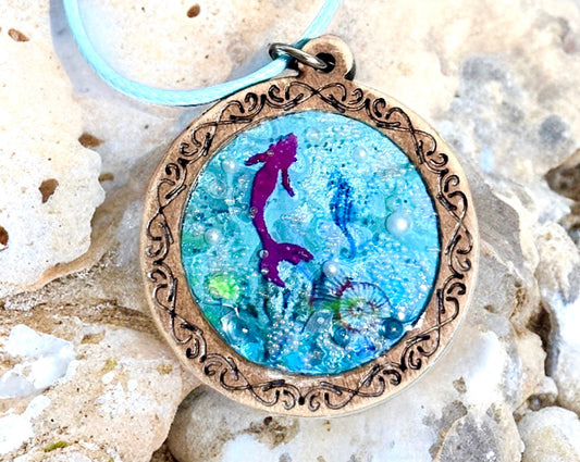 Young & Young at Heart Mermaid Ocean Fantasy Necklace-Beach Lover Unique Sea Blue Paint Skin Background Pendants-Stainless Steel-Wood-Chain