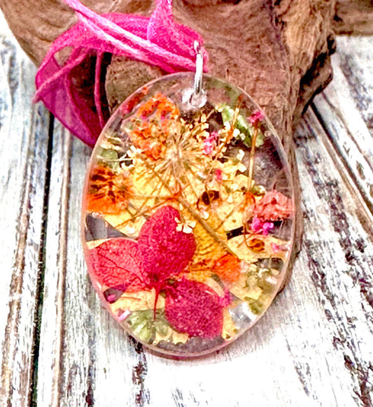 Pink, Orange & Gold Oval Mixed Flower Resin Pendant Necklace-16” Organza and Cotton Cord Chain w/Extender-Oval Crystal Clear Resin Pendant