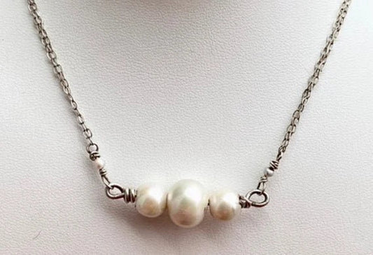 Trendy Genuine Pearls in Silver Bar Pendant Necklace