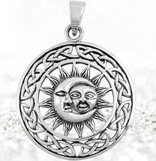 Sun and Moon Charm Pendant-34mm .925 Sterling Silver Round-Celestial Spiritual Meditation Jewelry-Celtic-Graduate or New Job Gift