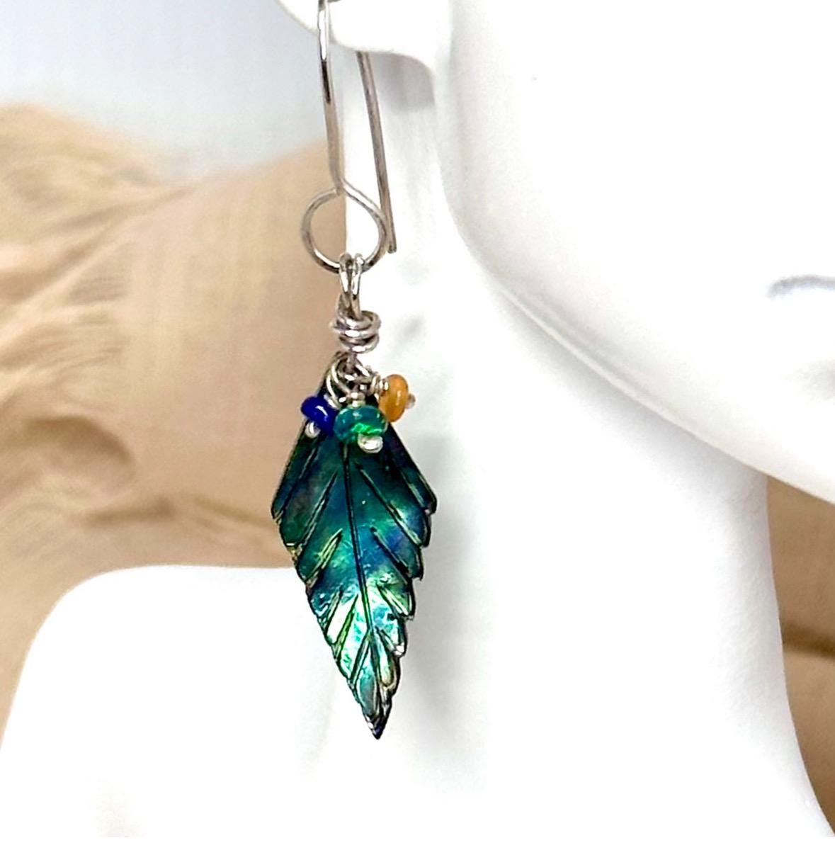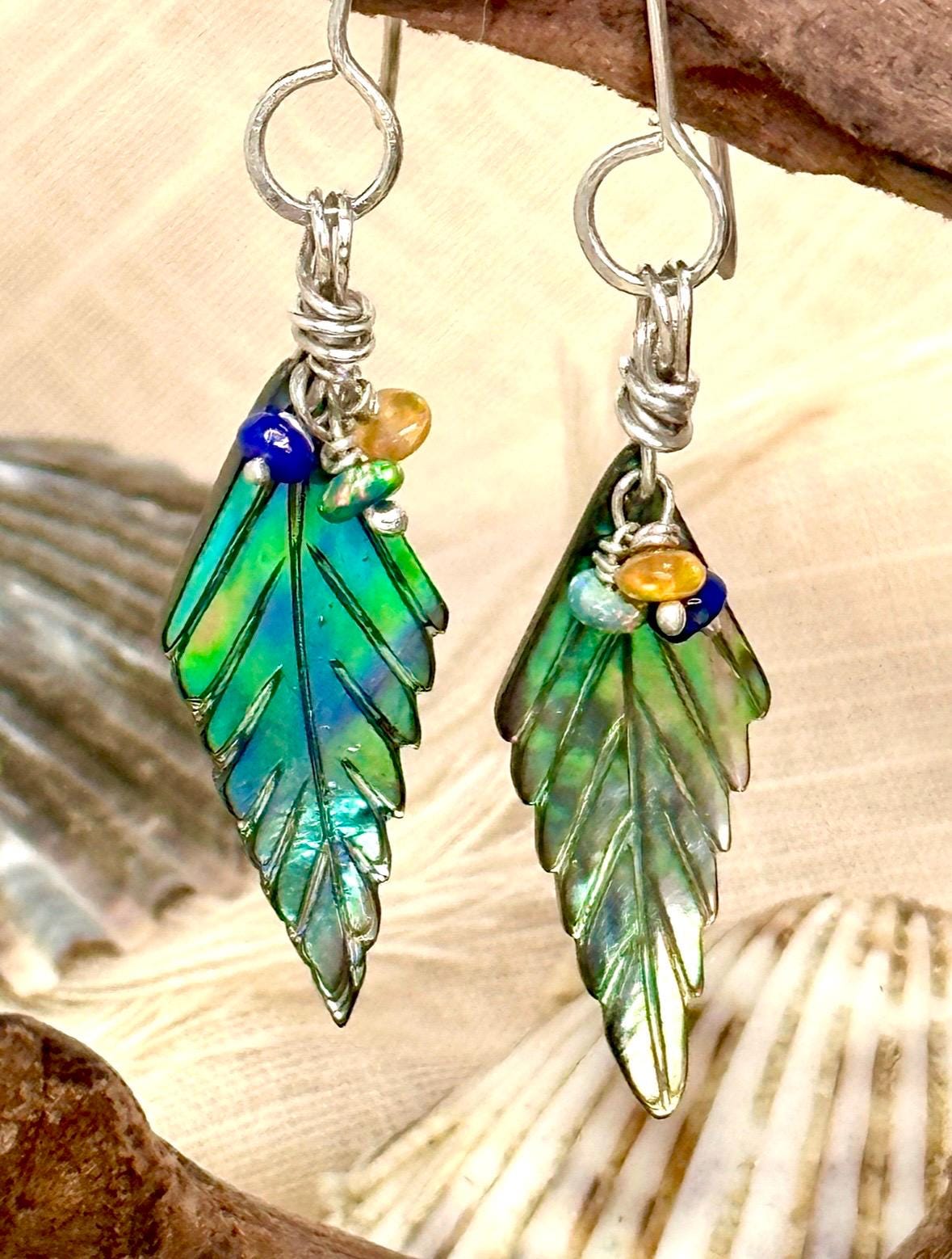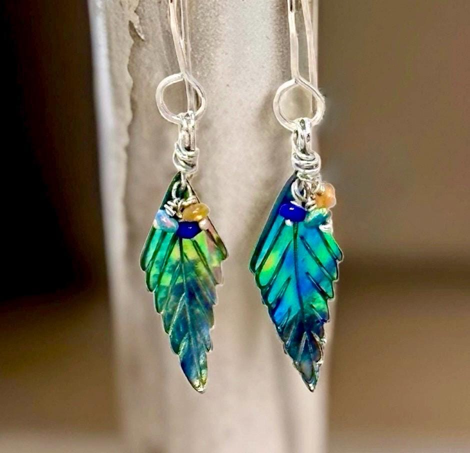 Abalone, Opal and .925 Sterling Silver Dangle Earrings, Leaf Shaped, Welo Opal Beads, Colorful Shell Minimalist Jewelry