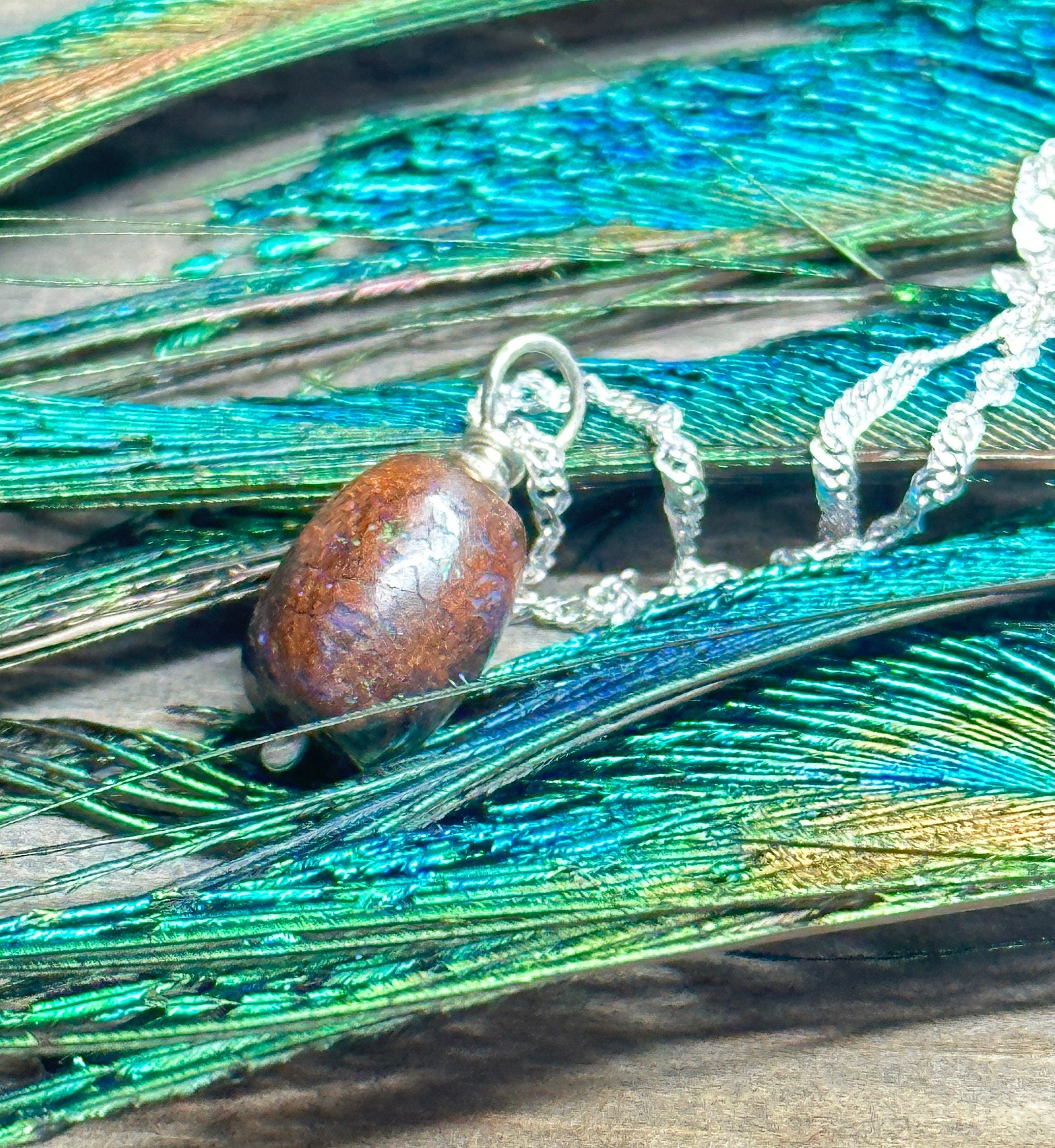 Colorful Genuine Boulder Opal Barrel Bead Minimalist Pendant Necklace, Sparkling 11.2x8.4mm Sterling Silver Chain and Opal