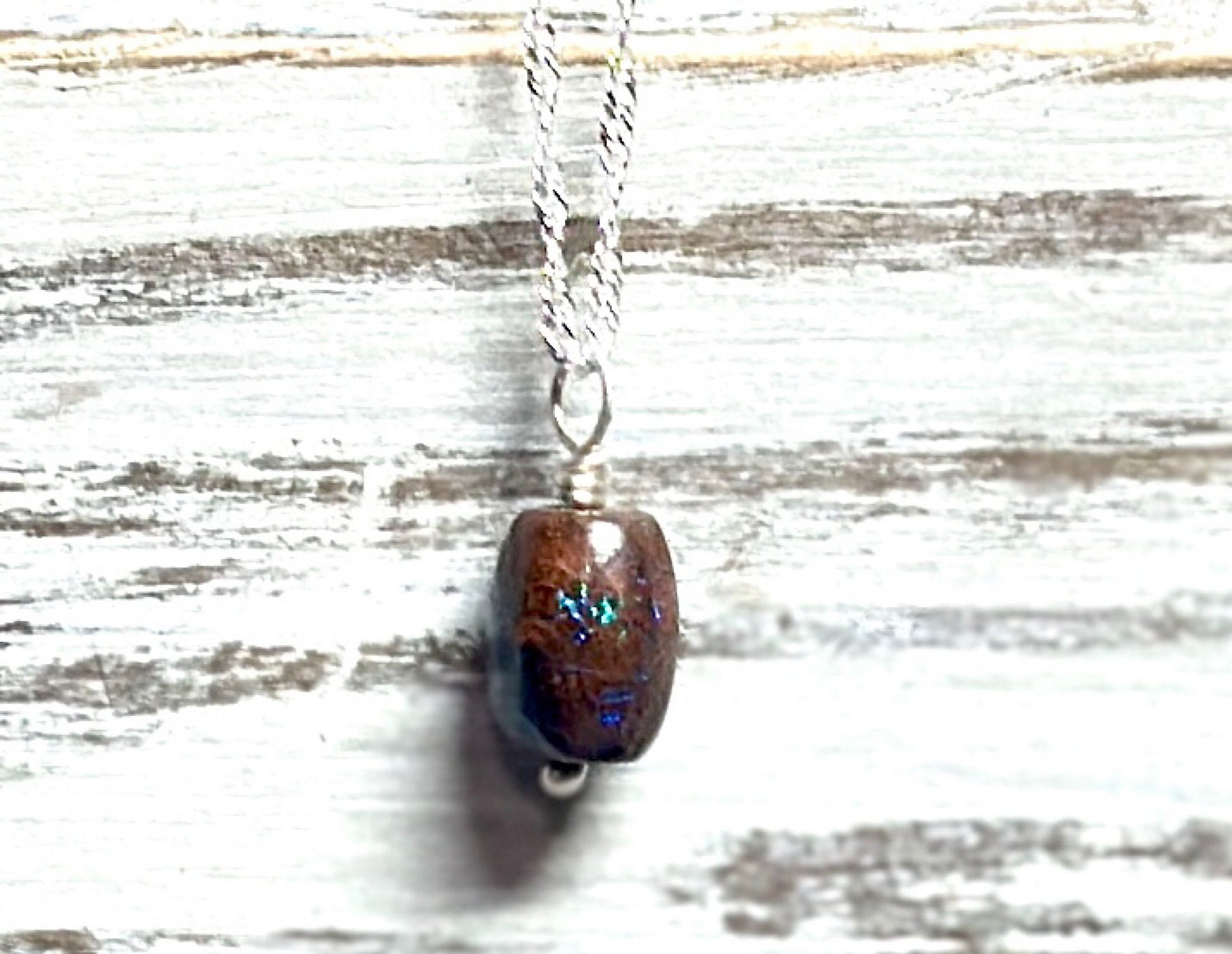 This Australian Boulder Opal Bead Pendant necklace is a flashy minimalist piece. The beautiful bead pendant is 11.2x8.4mm and it hangs from a 16", 1.7mm Singapore chain.