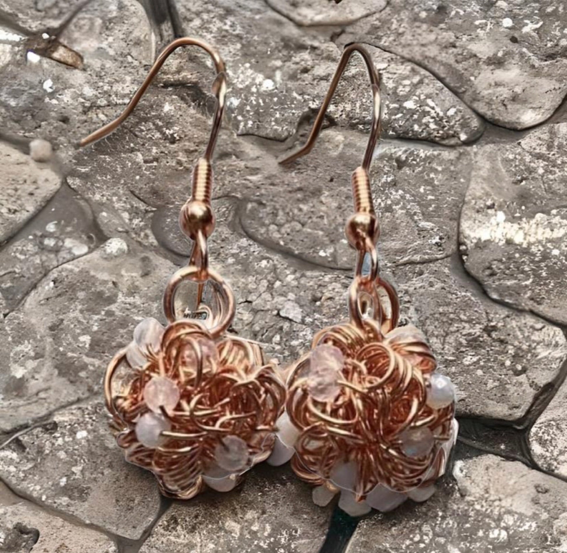 Raw Solid Copper & Moonstone Dangle Earrings-Tangled Coiled Balls-Twisted Balled Minimalist BoHo Style-Handmade in the USA