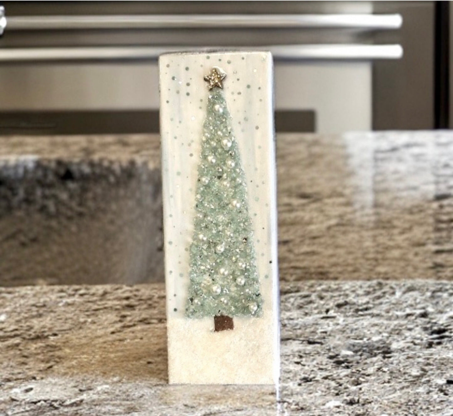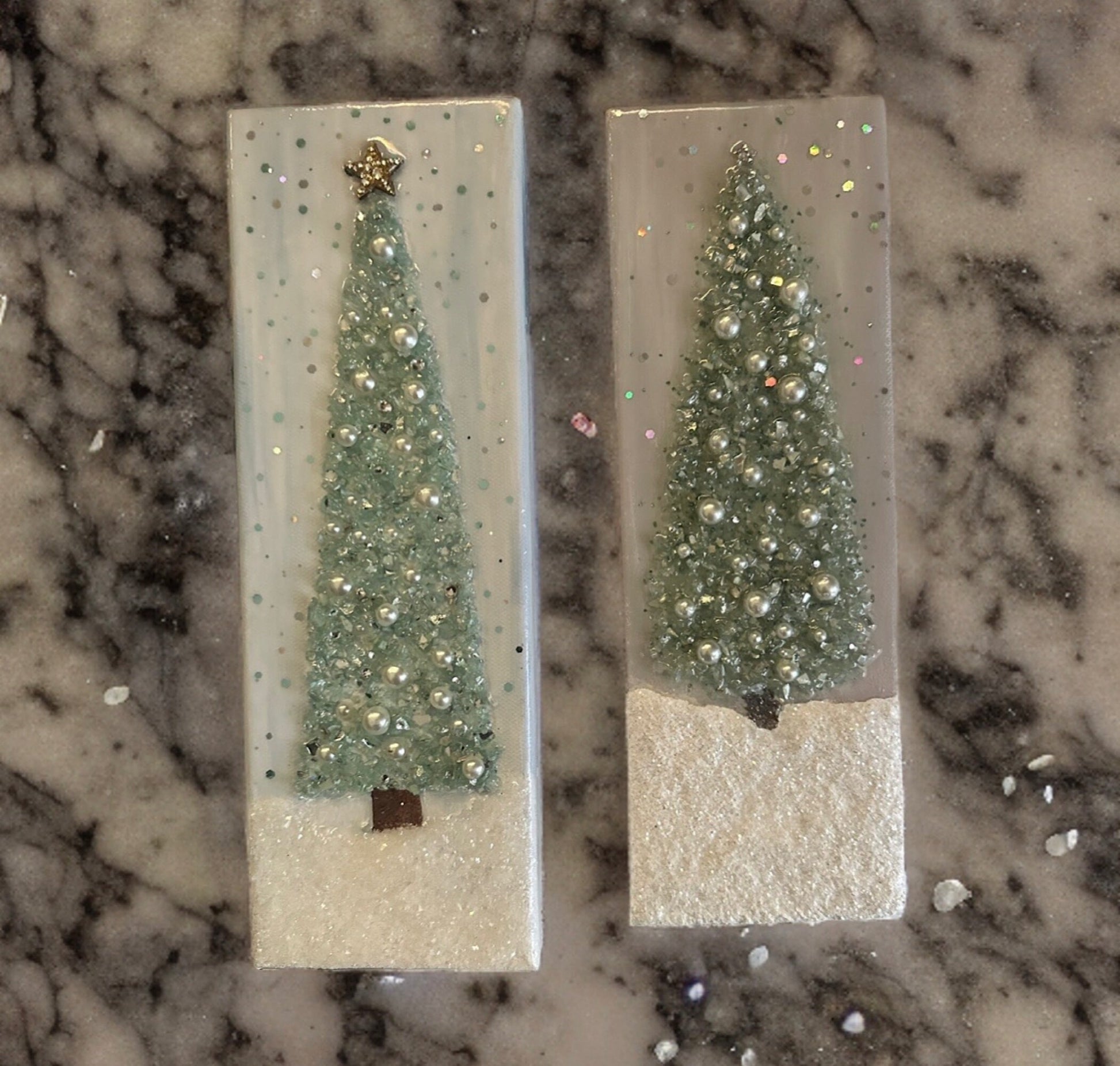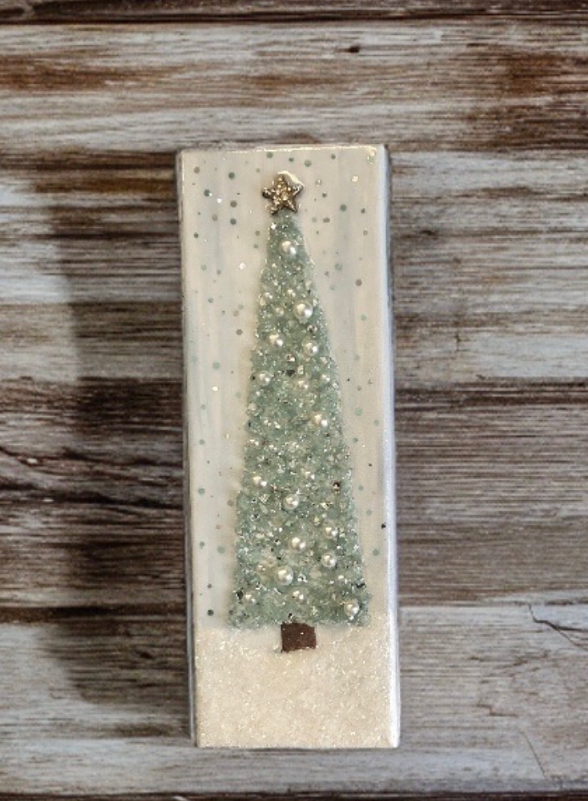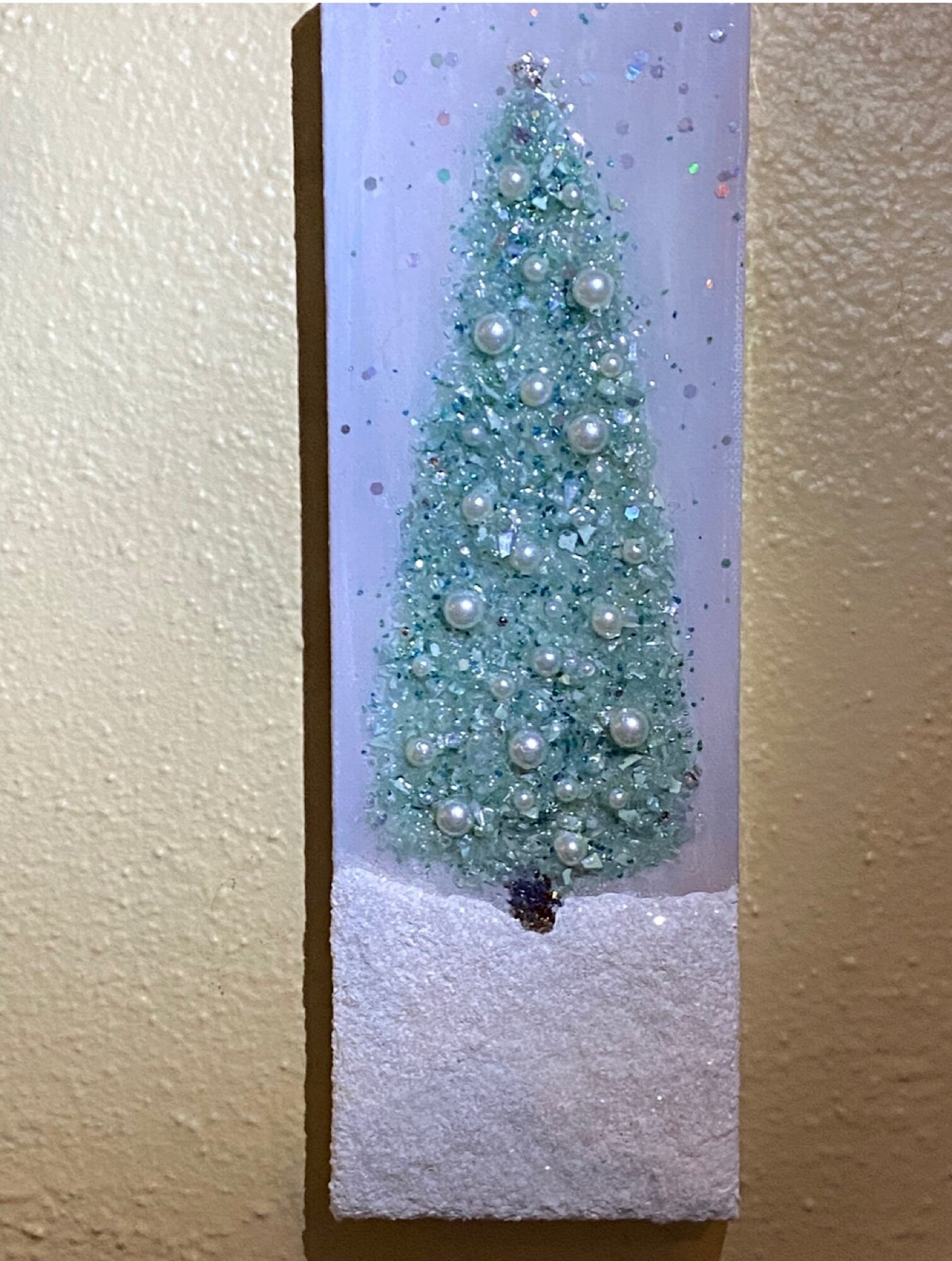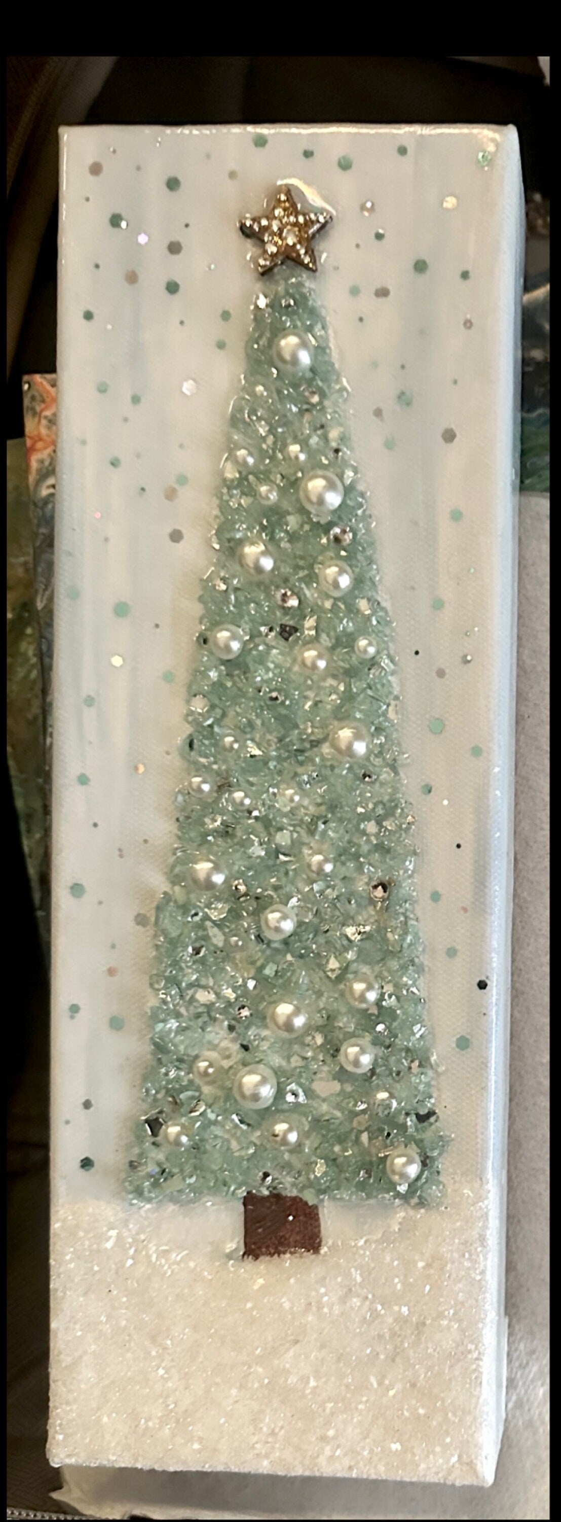 12x4" Stretched Canvas or Cradled Wood Canvas Crushed glass sparkling mixed media Christmas Tree painting.
