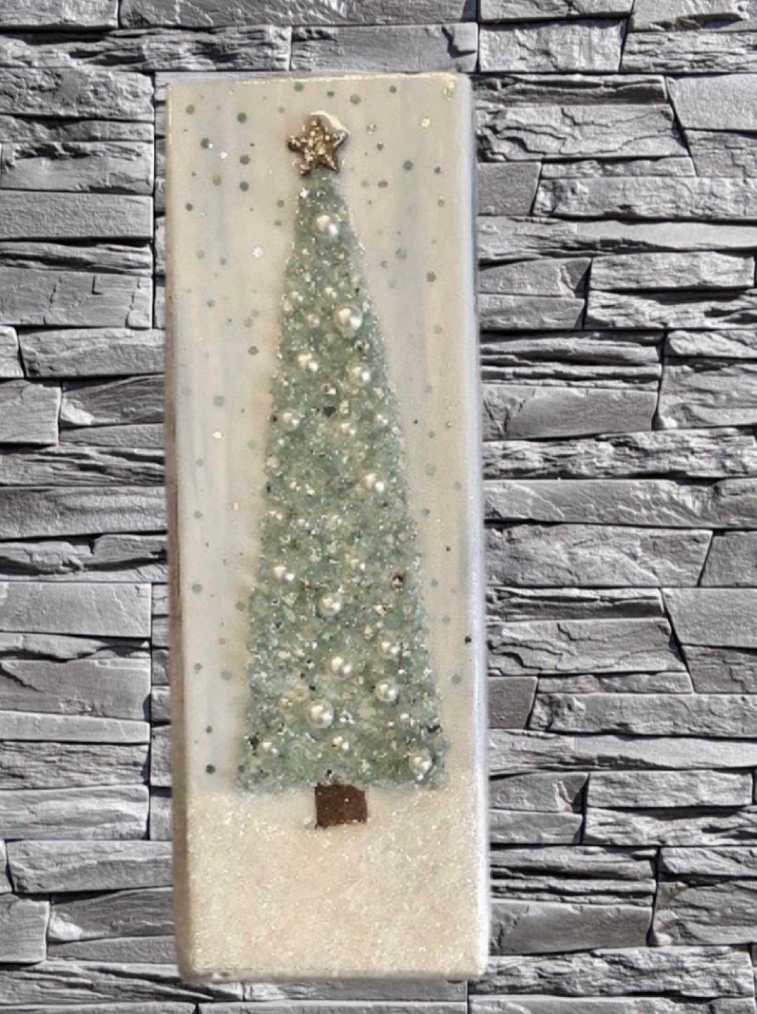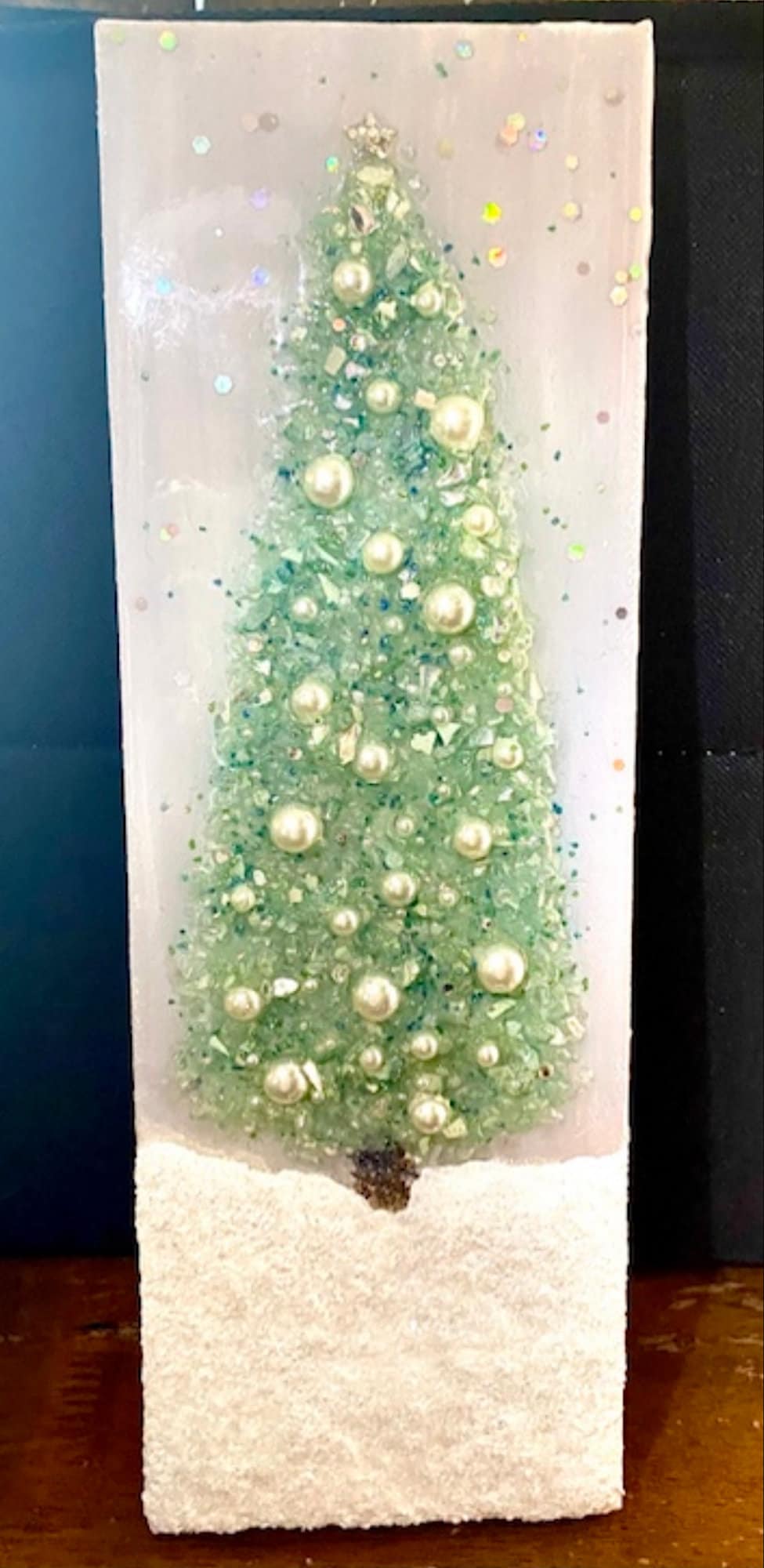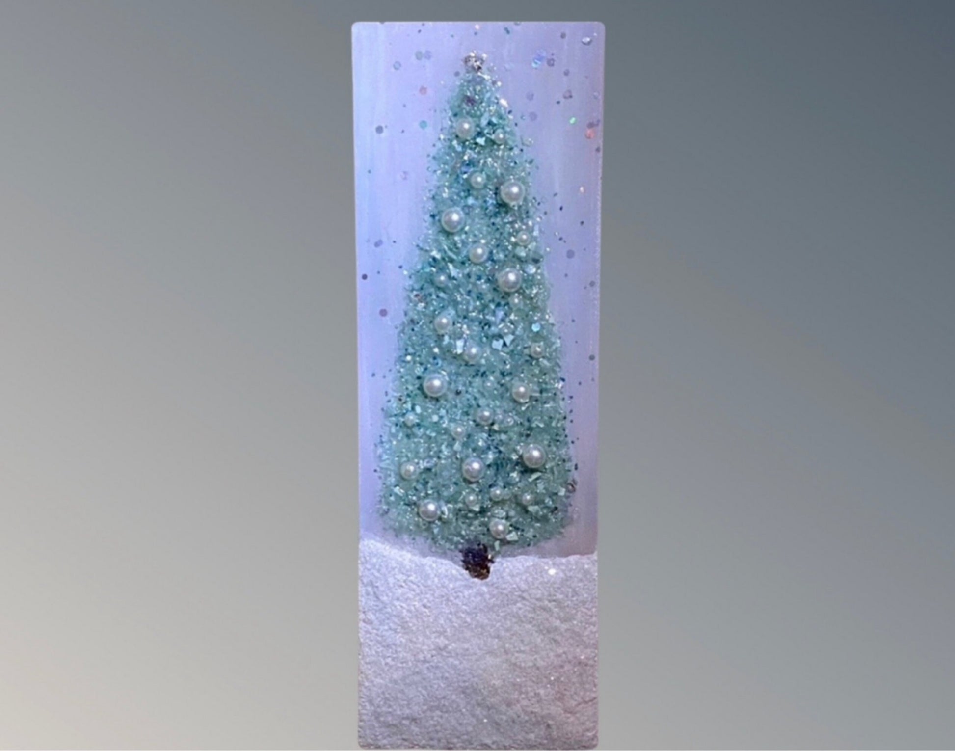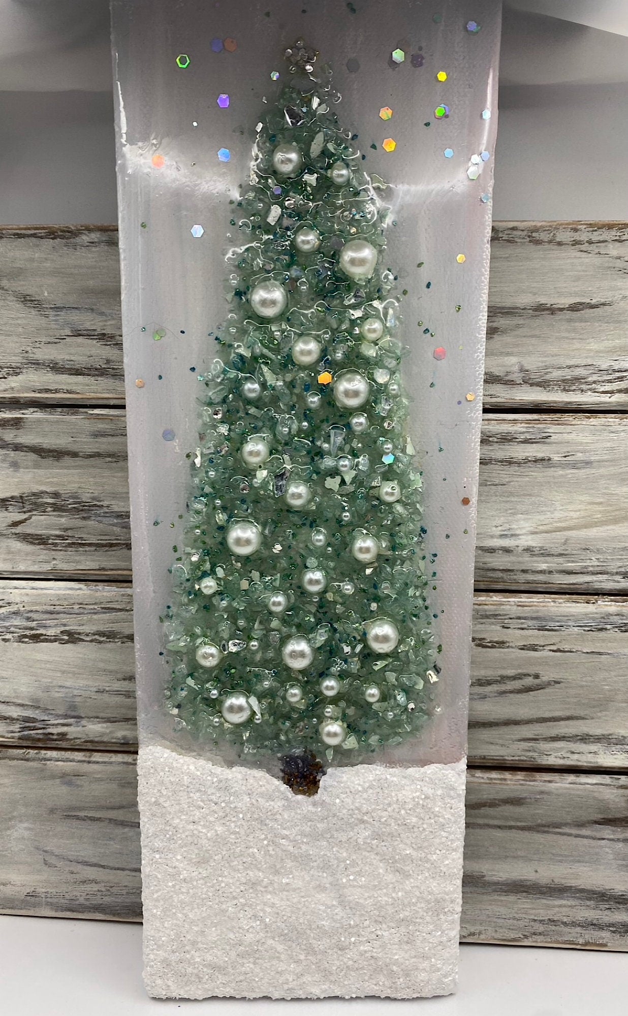 This beauty is a beautiful aqua colored crushed glass tree with white/Pearl strategically placed “ornaments”, It is embedded in a sheet of gleaming, non yellowing resin.