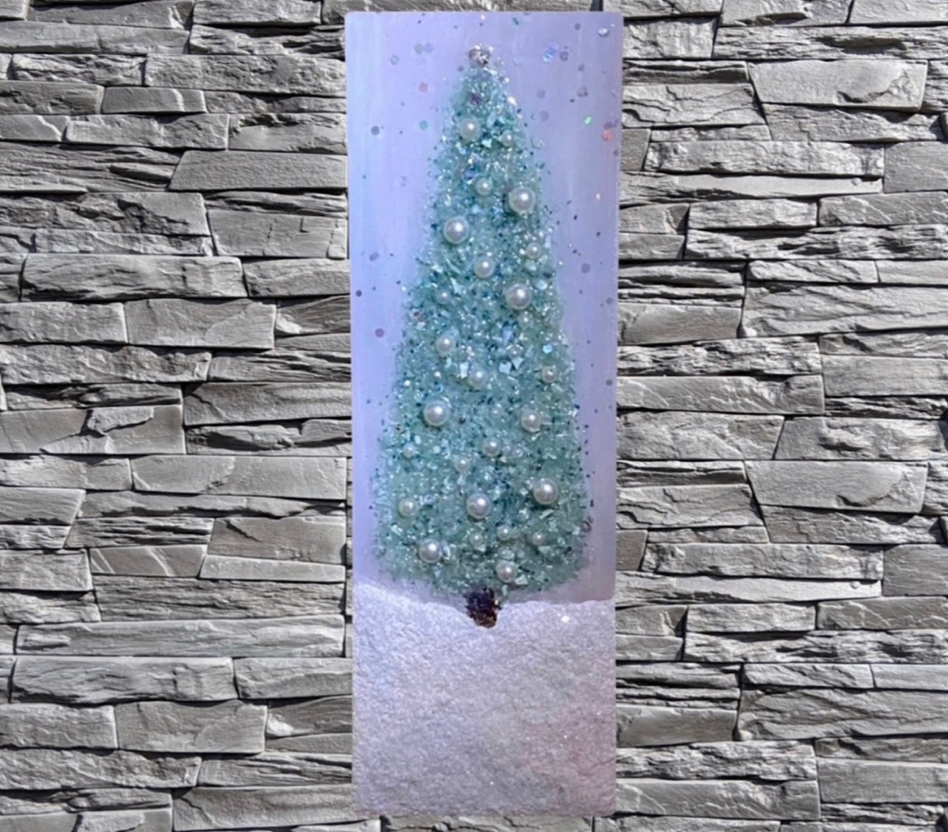 Aqua Green Blue Resin Coated 4x12" Christmas Tree Wall Hanging, Crushed Glass & Tiny Ornaments Bling Mantle Art, Stretched Linen Canvas