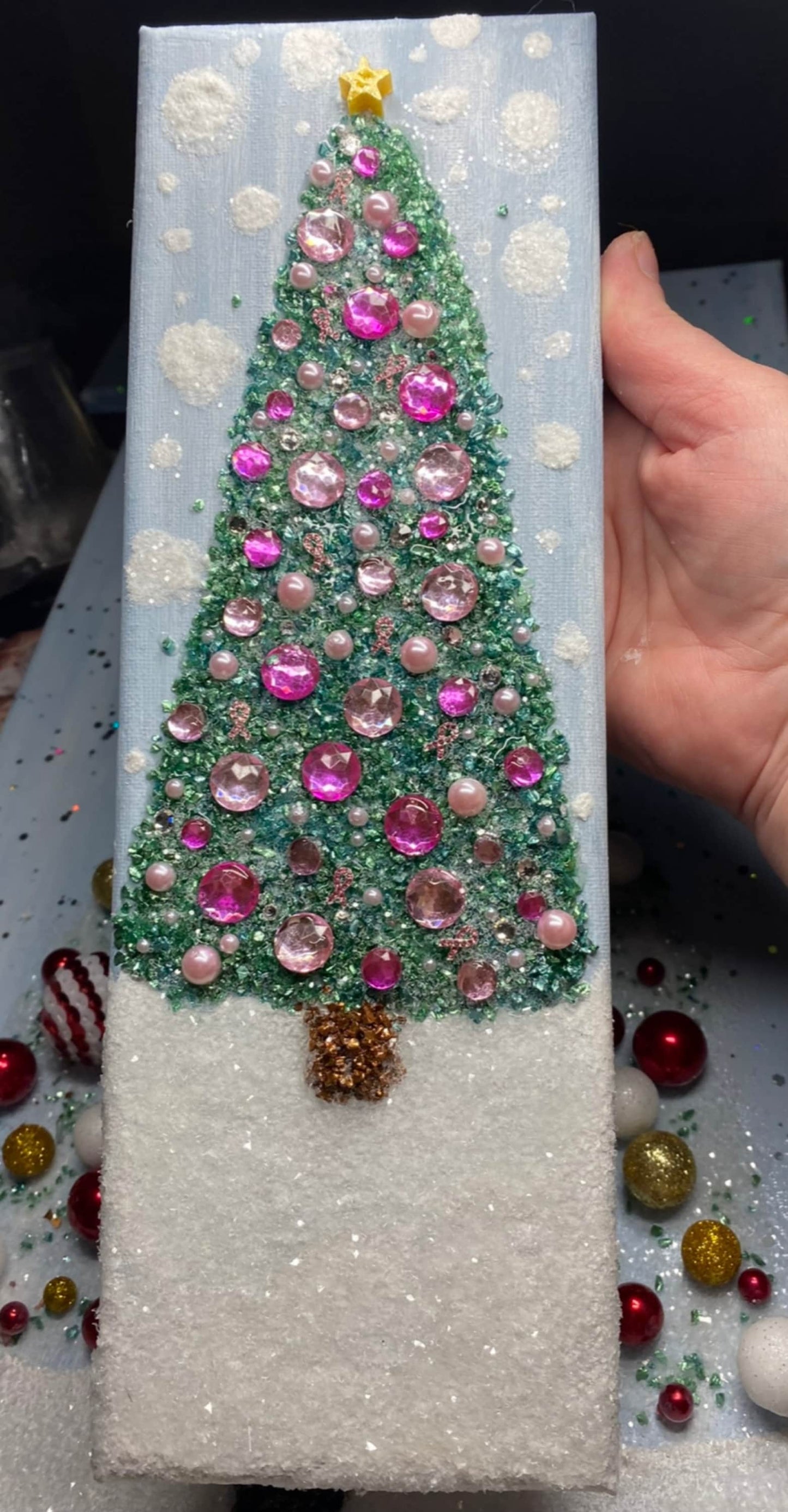 Crushed Glass and Resin 4x12" Awareness Christmas Tree Wall Hanging, Bling Tree & Tiny Ornaments, Mantle or Wall Art, Cancer Awareness