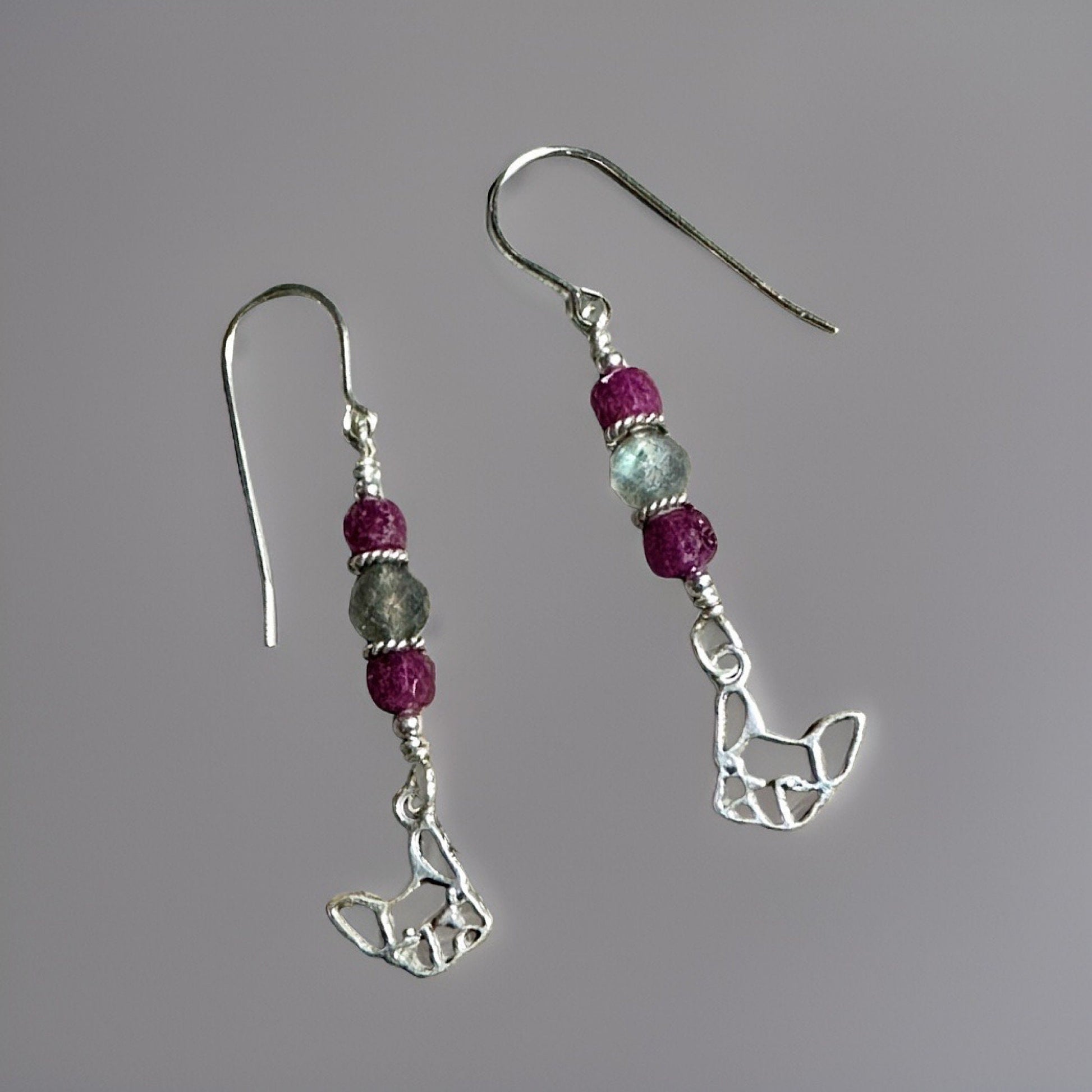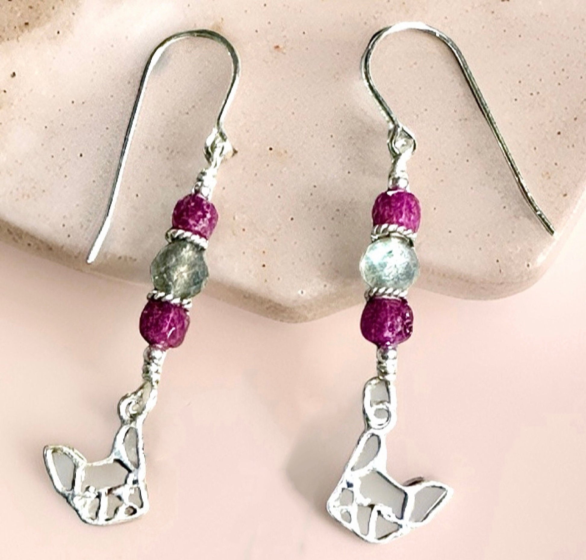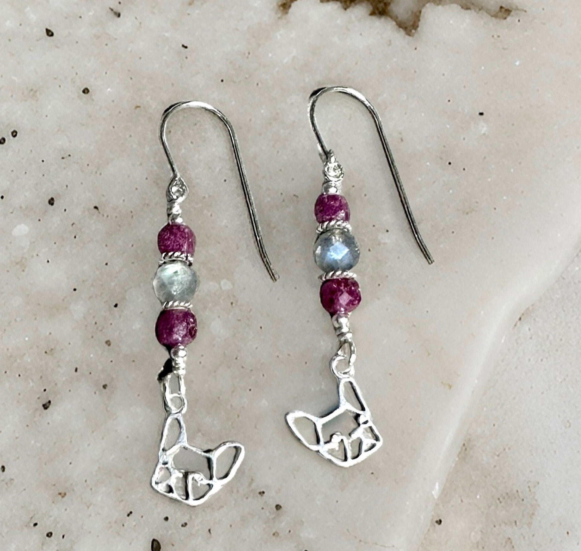 French Bulldog Earrings-.925 Sterling Silver Frenchie Dangles-Ruby & Rainbow Labradorite Gemstone Jewelry
