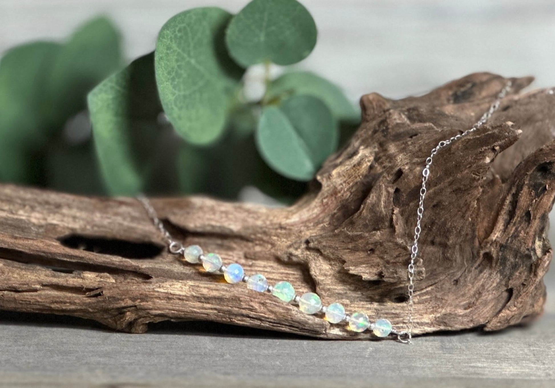 This necklace is very similar to our Opal Rondelle bar pendant necklace, but this one has round 5-6mm, faceted white Ethiopian Welo Opal beads and tiny 3mm Sterling silver beads.