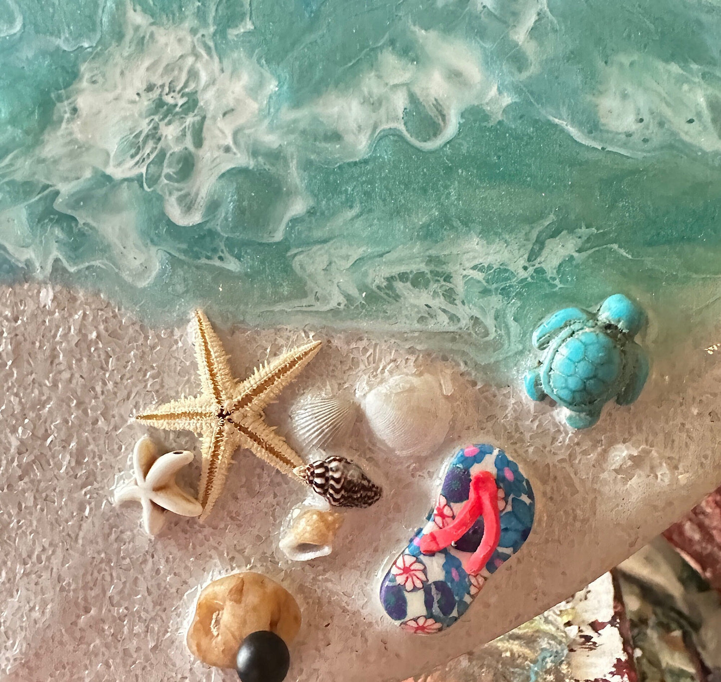 This piece displays genuine sand, pebbles, shells and starfish, along with adorable little ceramic, acrylic or clay embellishments for color and character.