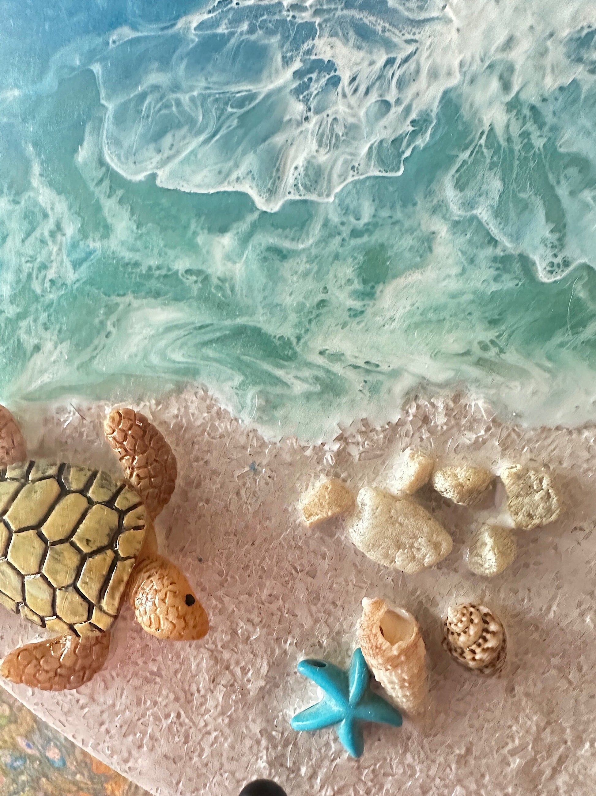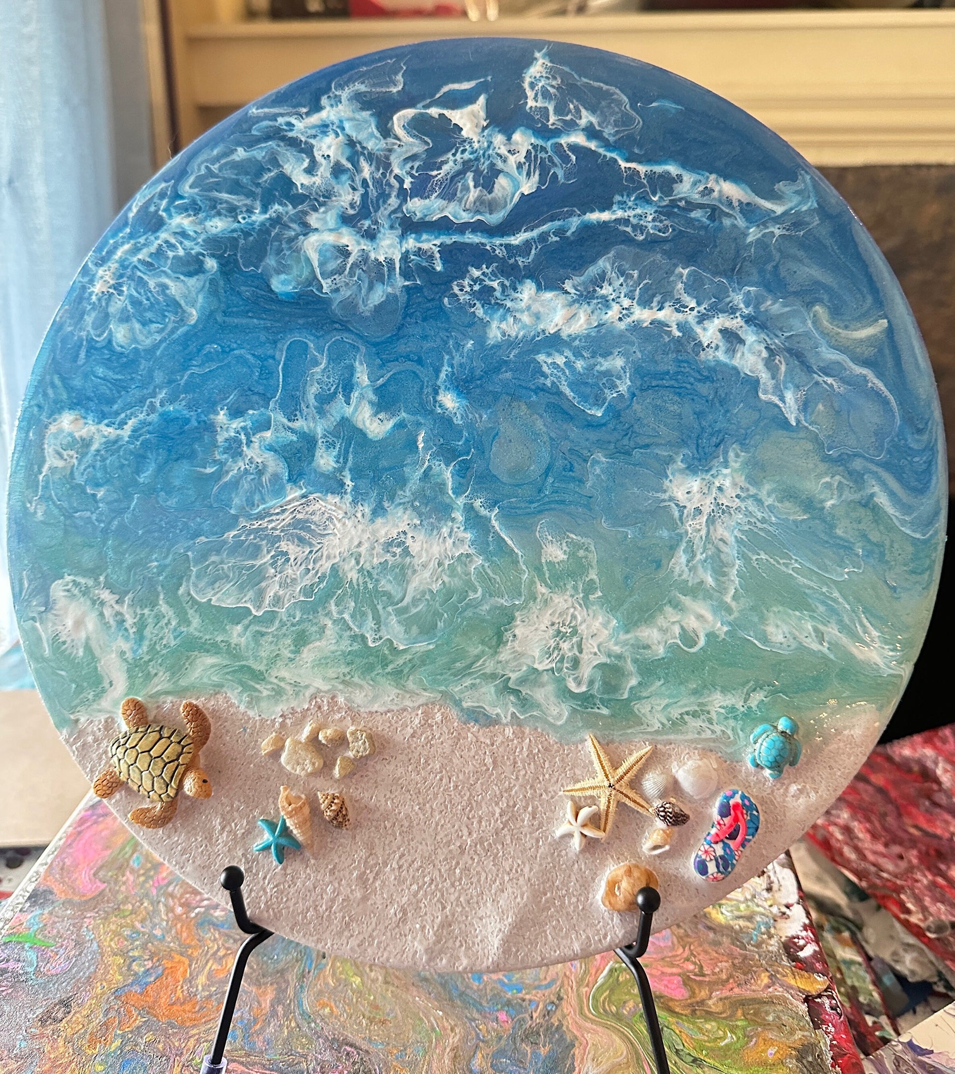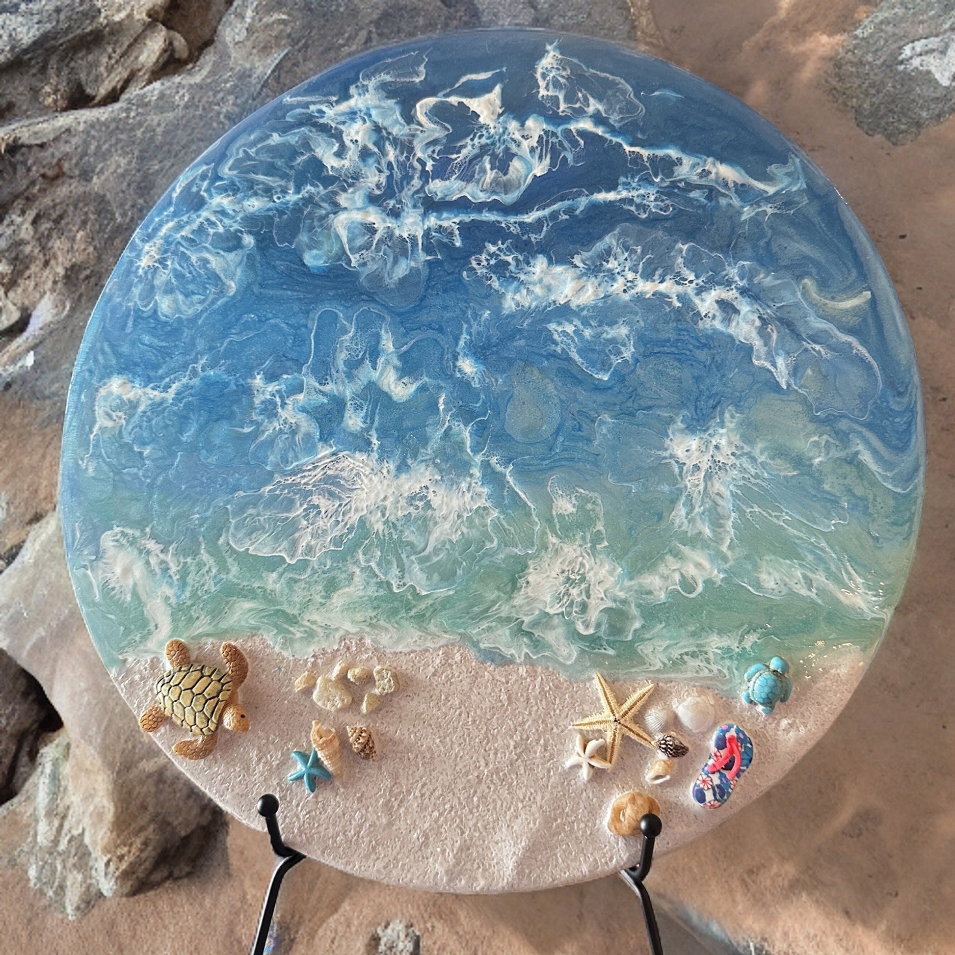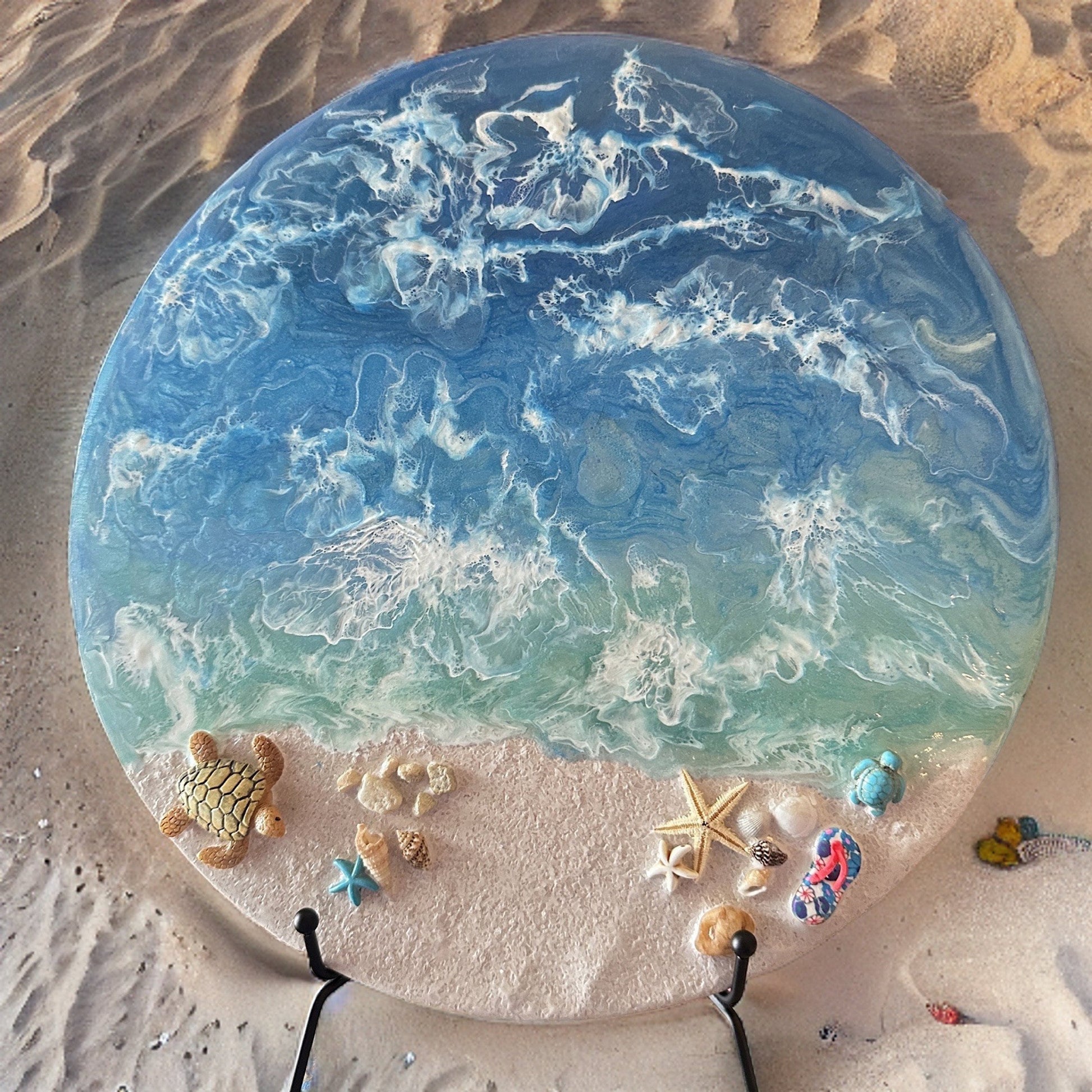 This cool coastal themed resin painting is created on a 12x12 flat circular wood canvas that is sturdy at approximately 4mm thick.