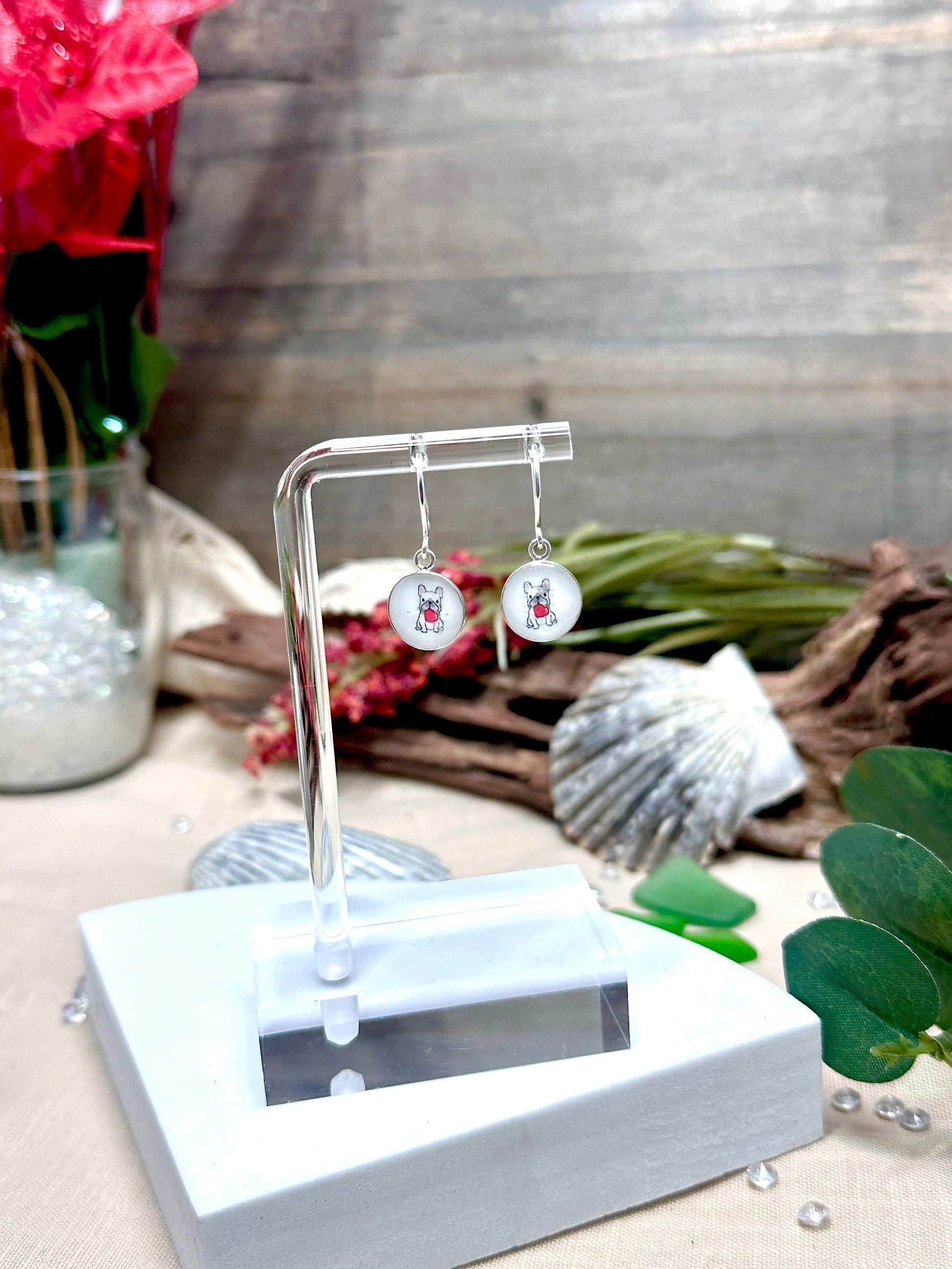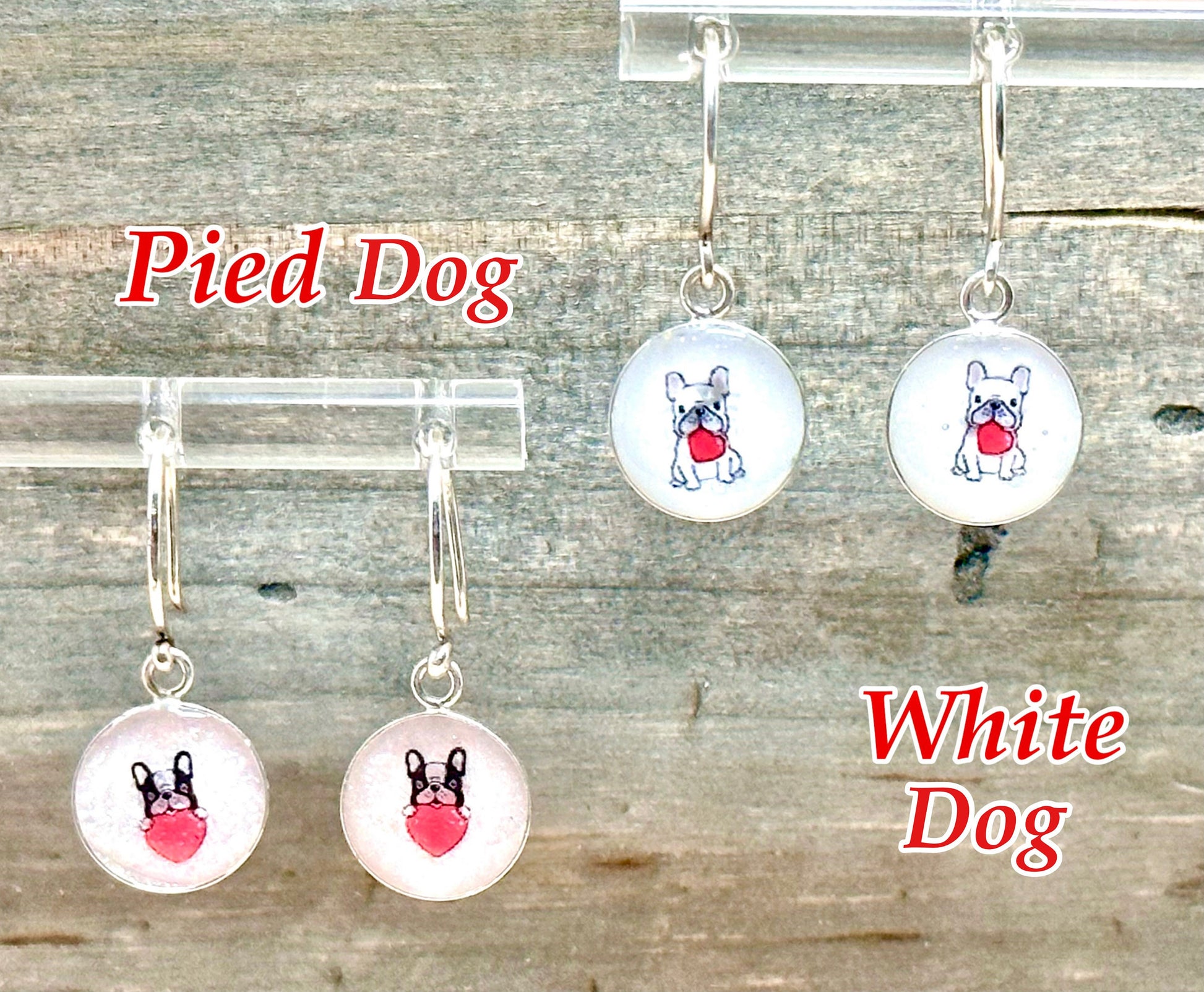 Adorable 10.5mm Sterling Silver French Bulldog Earrings-White/Red Heart Resin Frenchie-.925 Valentine’s Frenchie-2 Styles-Dog Breed Jewelry