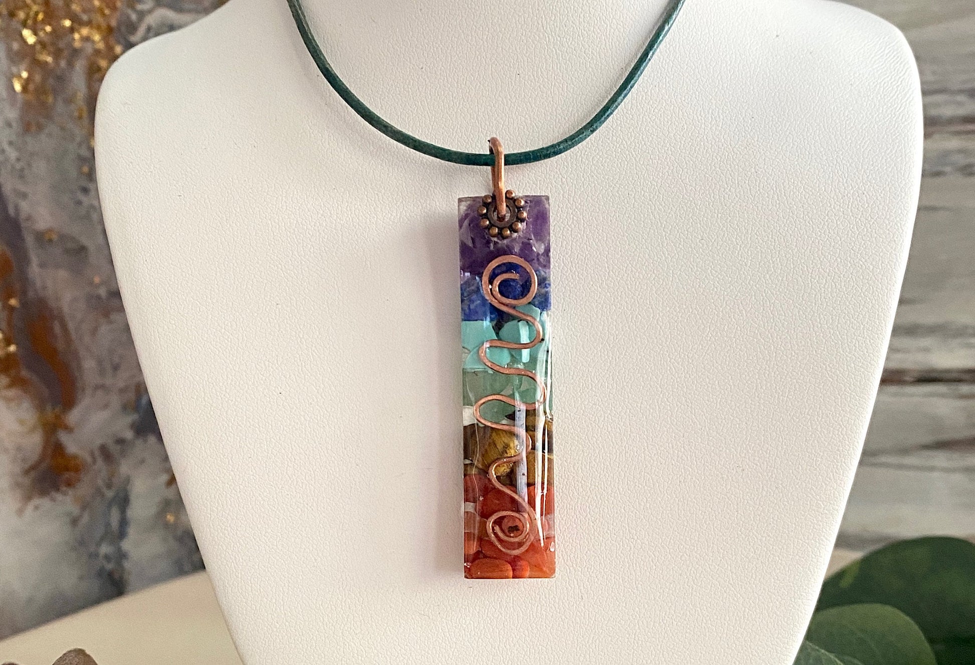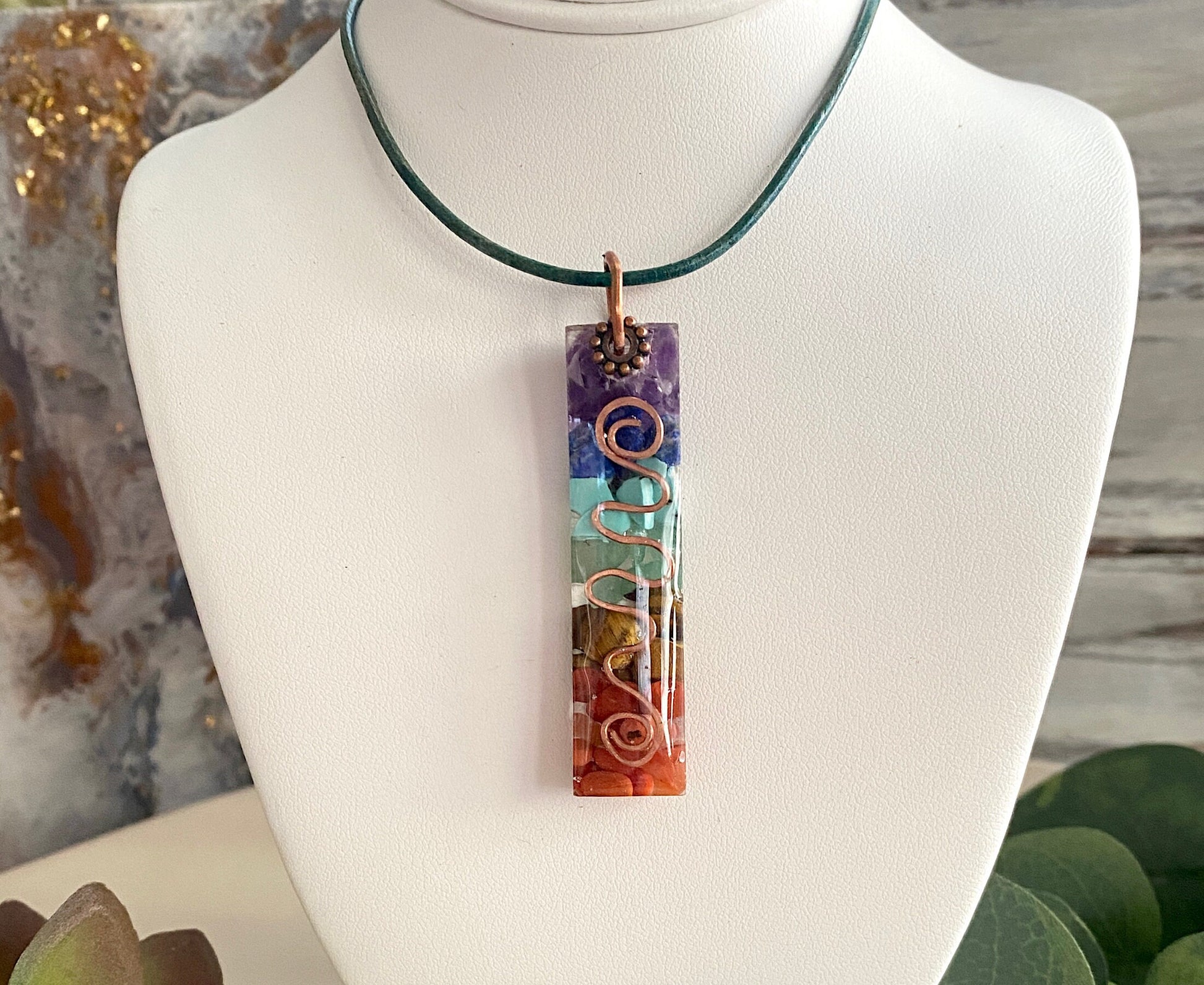 Chakra Stone Necklace-Healing Chakra in Resin-Chakra Stone Resin Pendant with Distressed Leather Cord