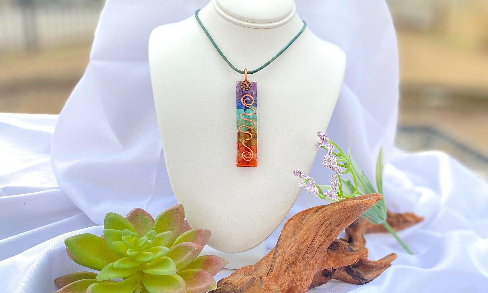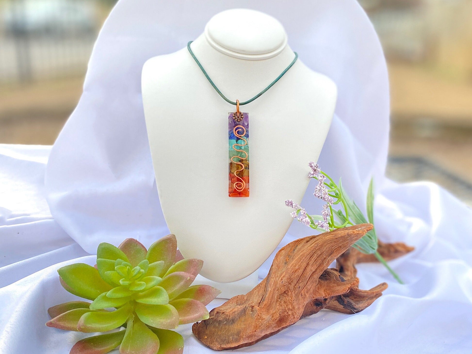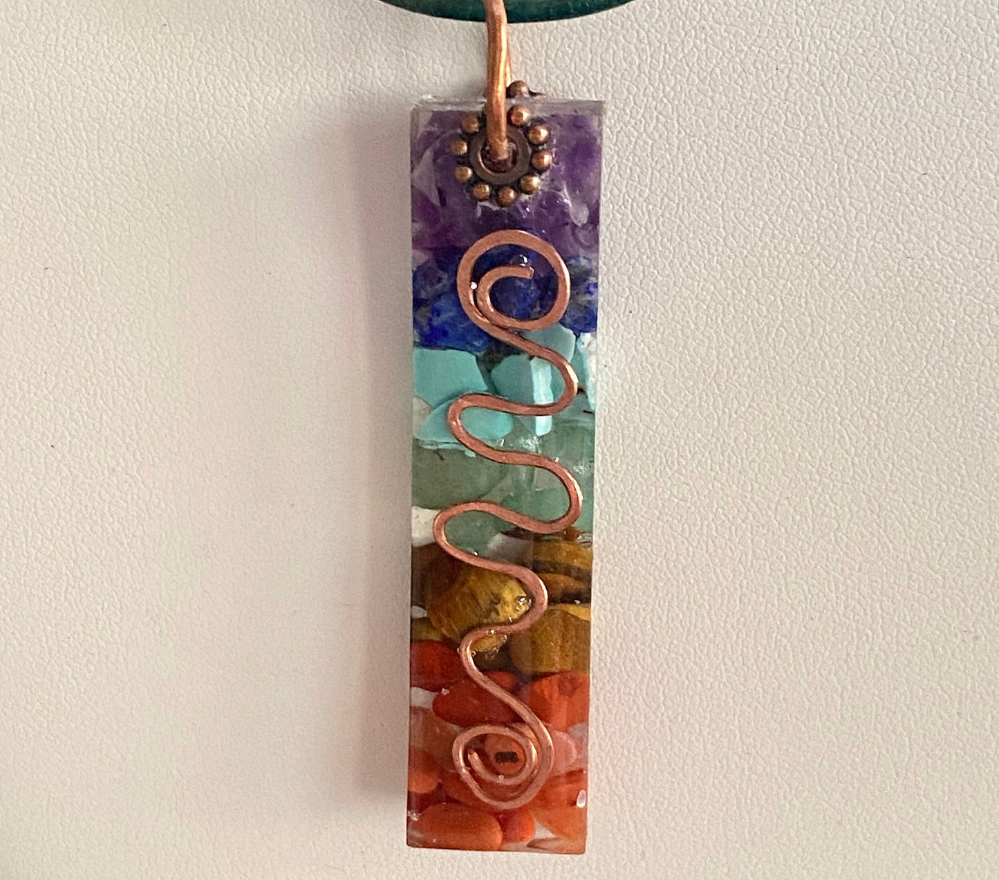 This necklace is a beautiful "rainbow" of healing chakra stones and abstract Orgone copper design.