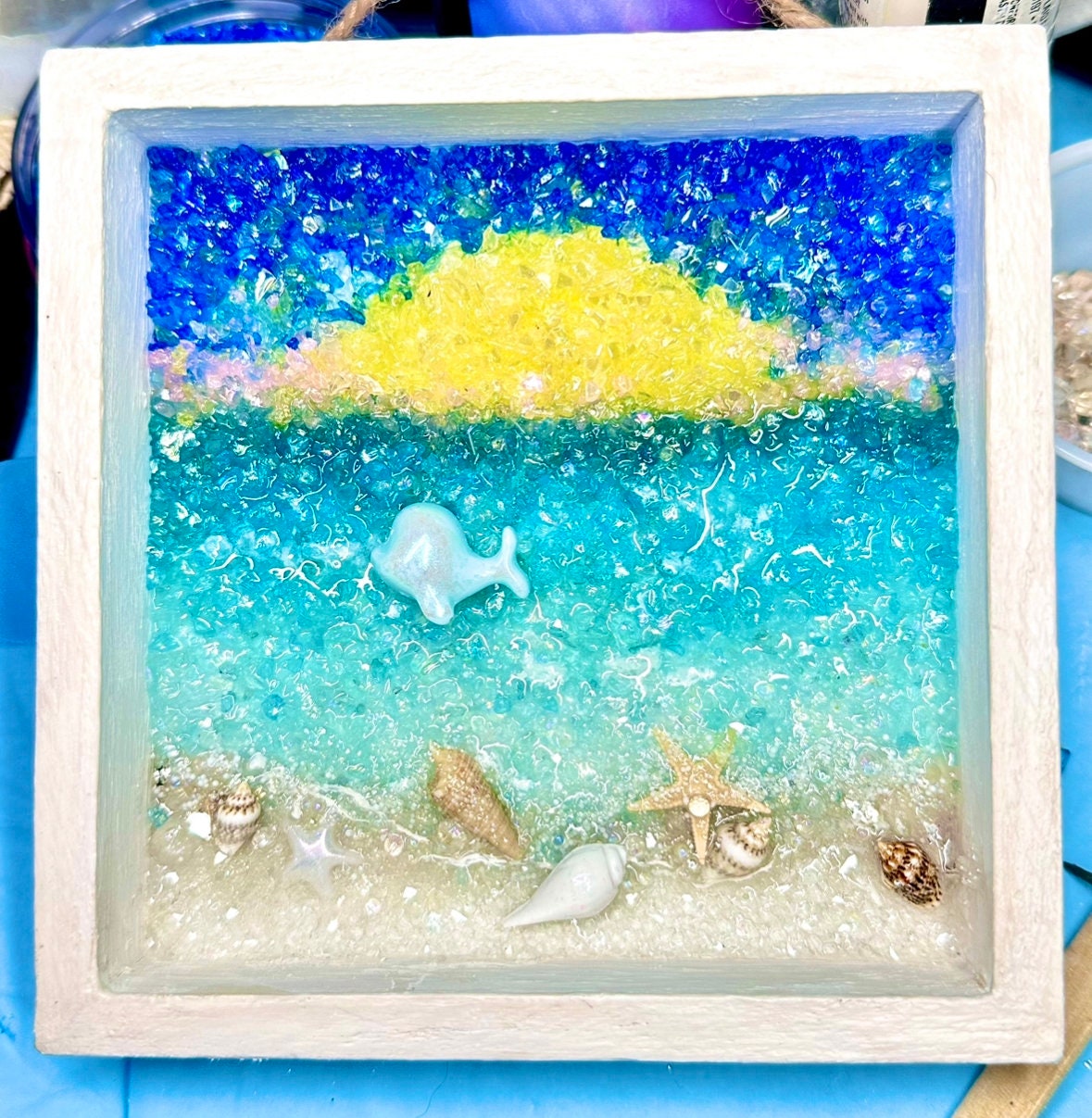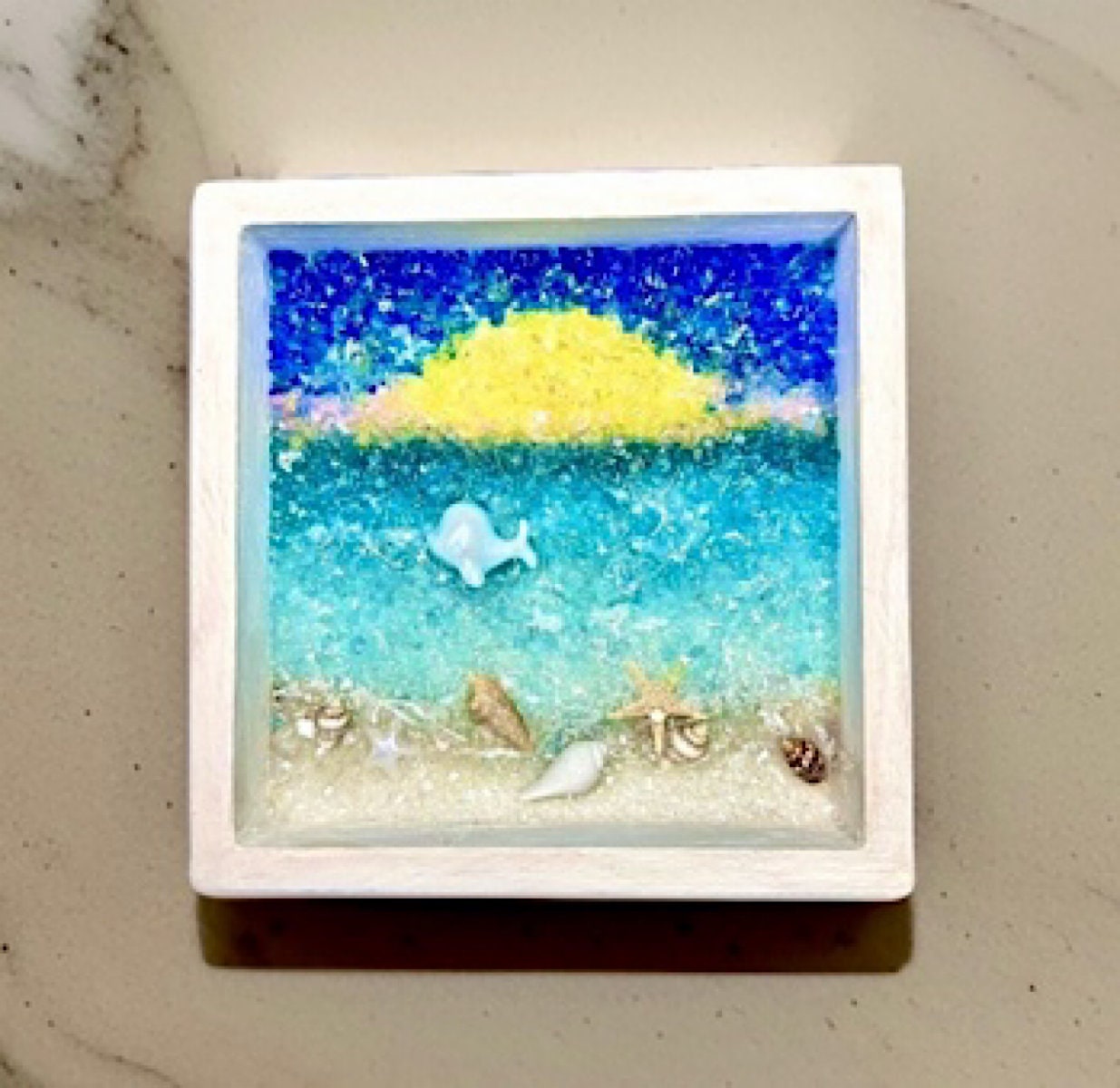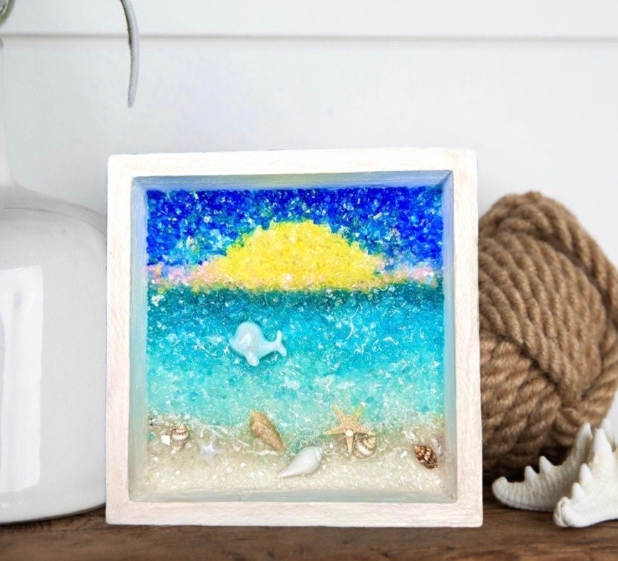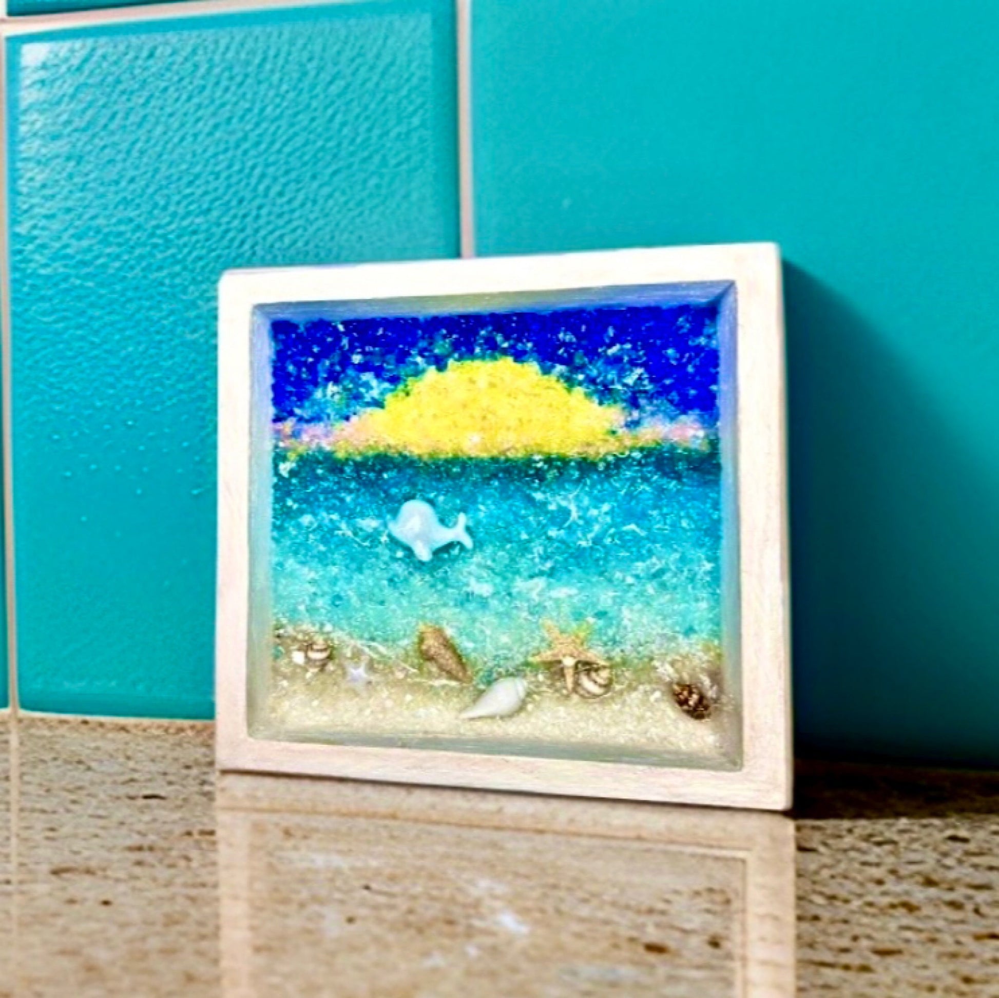 Crushed Glass and Resin 5X5” Beach Scene with Baby Beluga Whale-Perfect Gift for a Beach Themed Baby Nursery, Bathroom or Powder Room