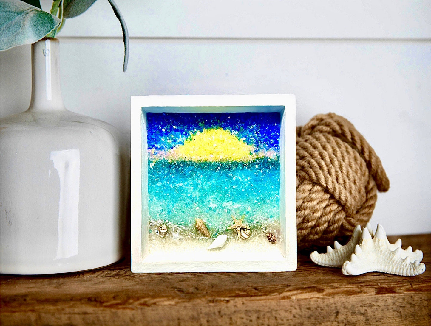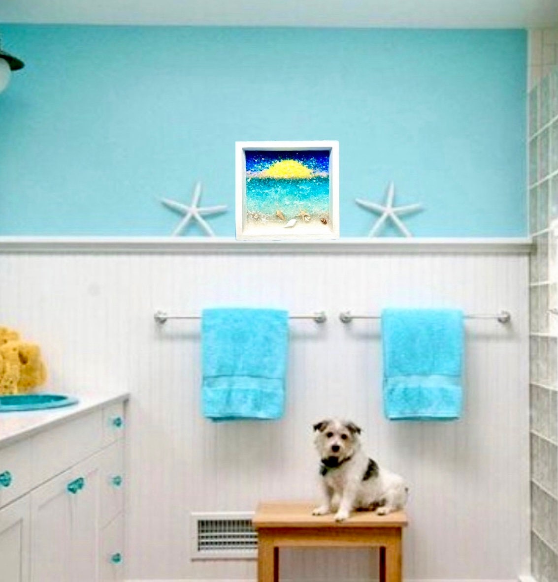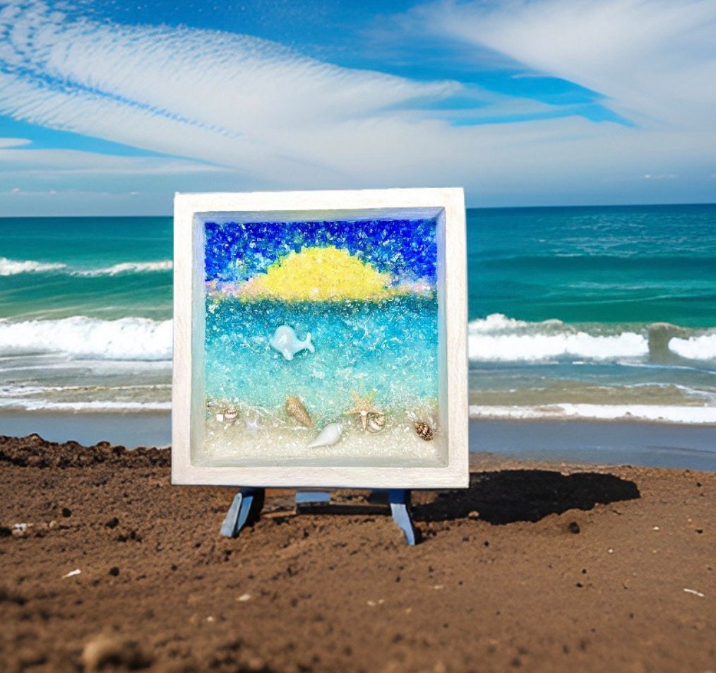 Crushed Glass and Resin 5X5” Beach Scene with Baby Beluga Whale-Perfect Gift for a Beach Themed Baby Nursery, Bathroom or Powder Room
