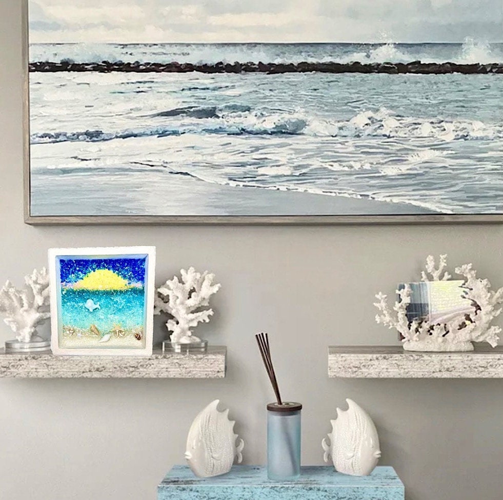 An adorable little 5X5” mixed media piece with the gradient colored ocean fading into the radiant horizon with an evening performance from that big radiant ball of fire. All is covered with a shimmering layer of non-yellowing resin.