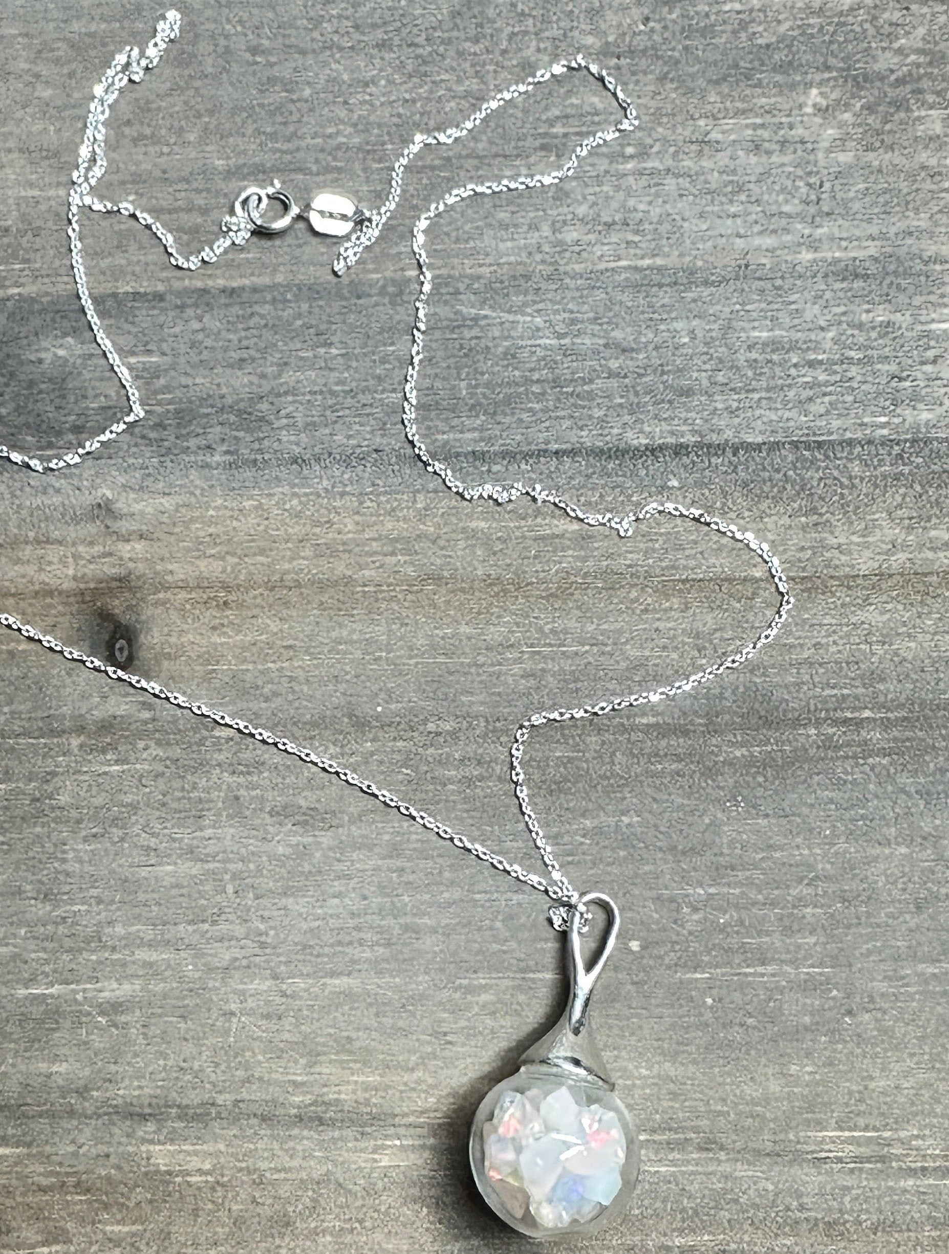 Opal Crystal 14mm Globe in Sterling Silver Necklace-White Ethiopian Welo Opal Chunks/Chips-Special Gift-.925 Sterling-October Birthstone