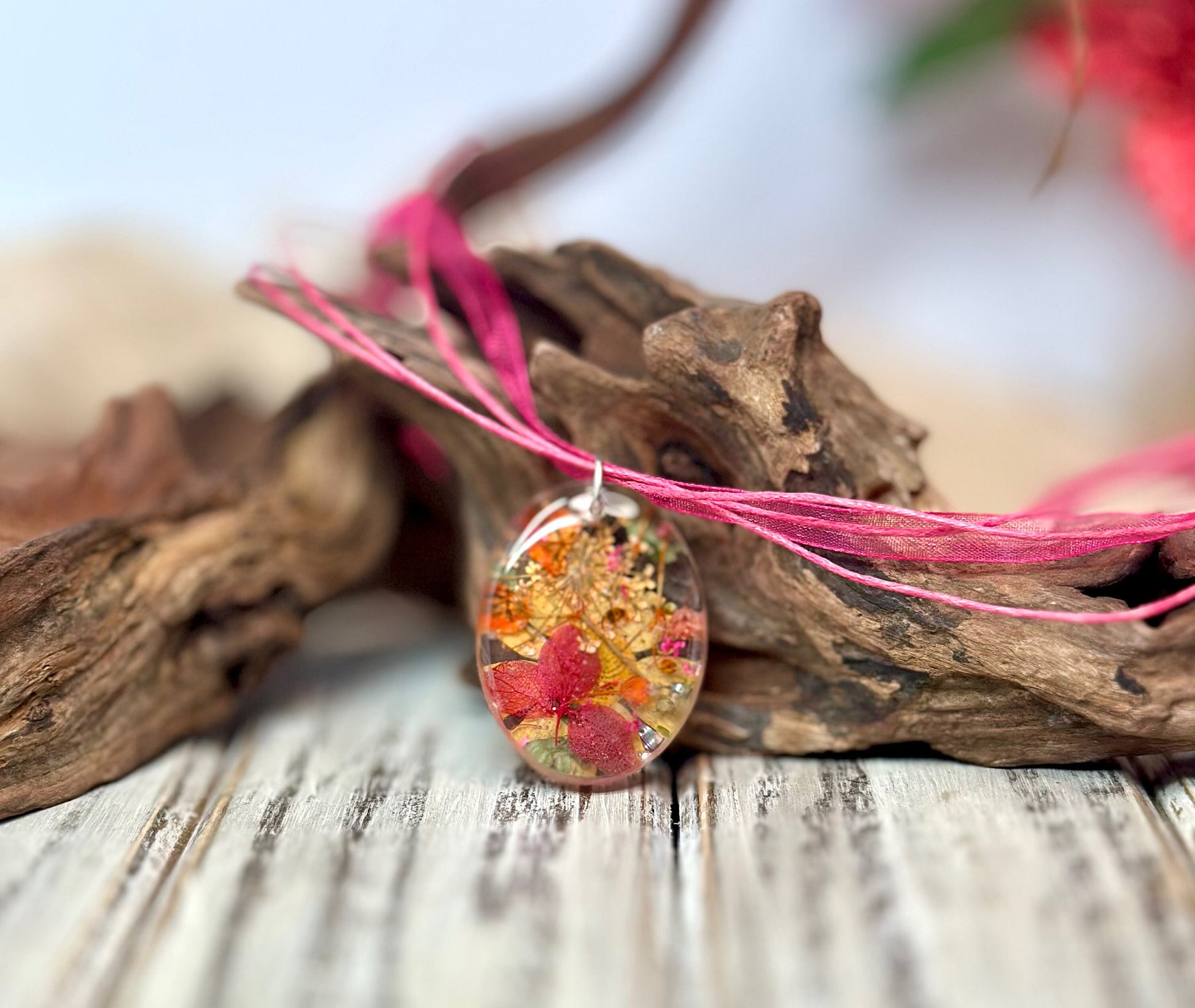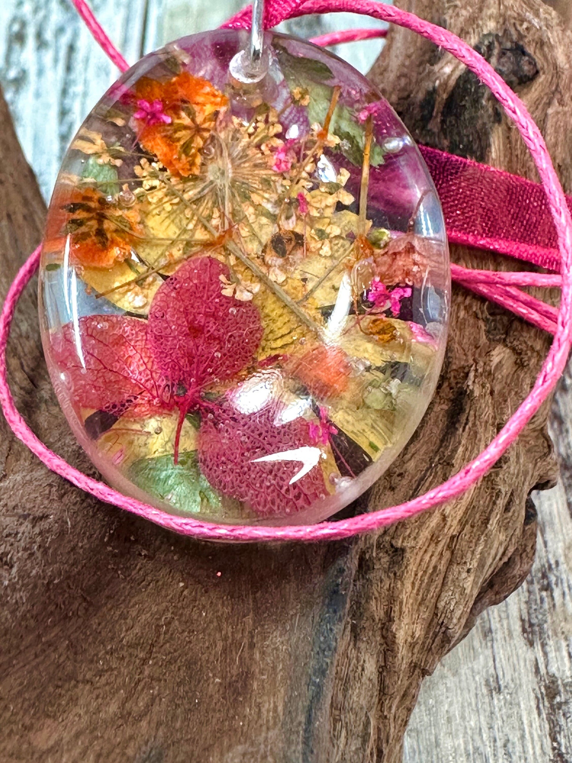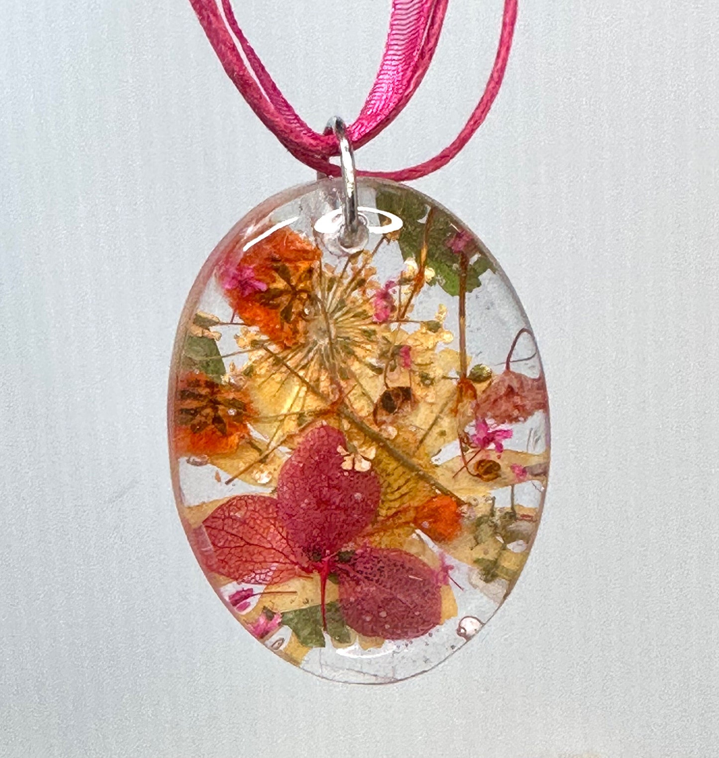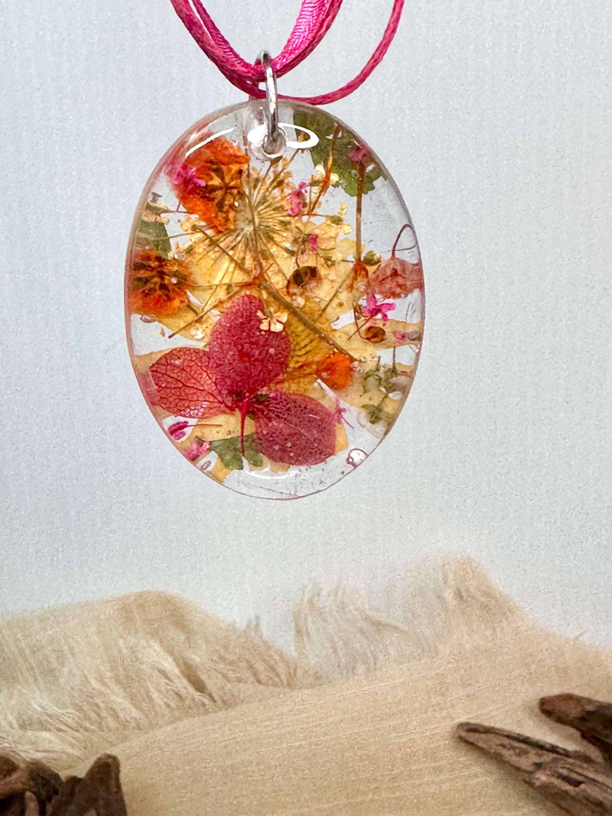 Pink, Orange & Gold Oval Mixed Flower Resin Pendant Necklace-16” Organza and Cotton Cord Chain w/Extender-Oval Crystal Clear Resin Pendant