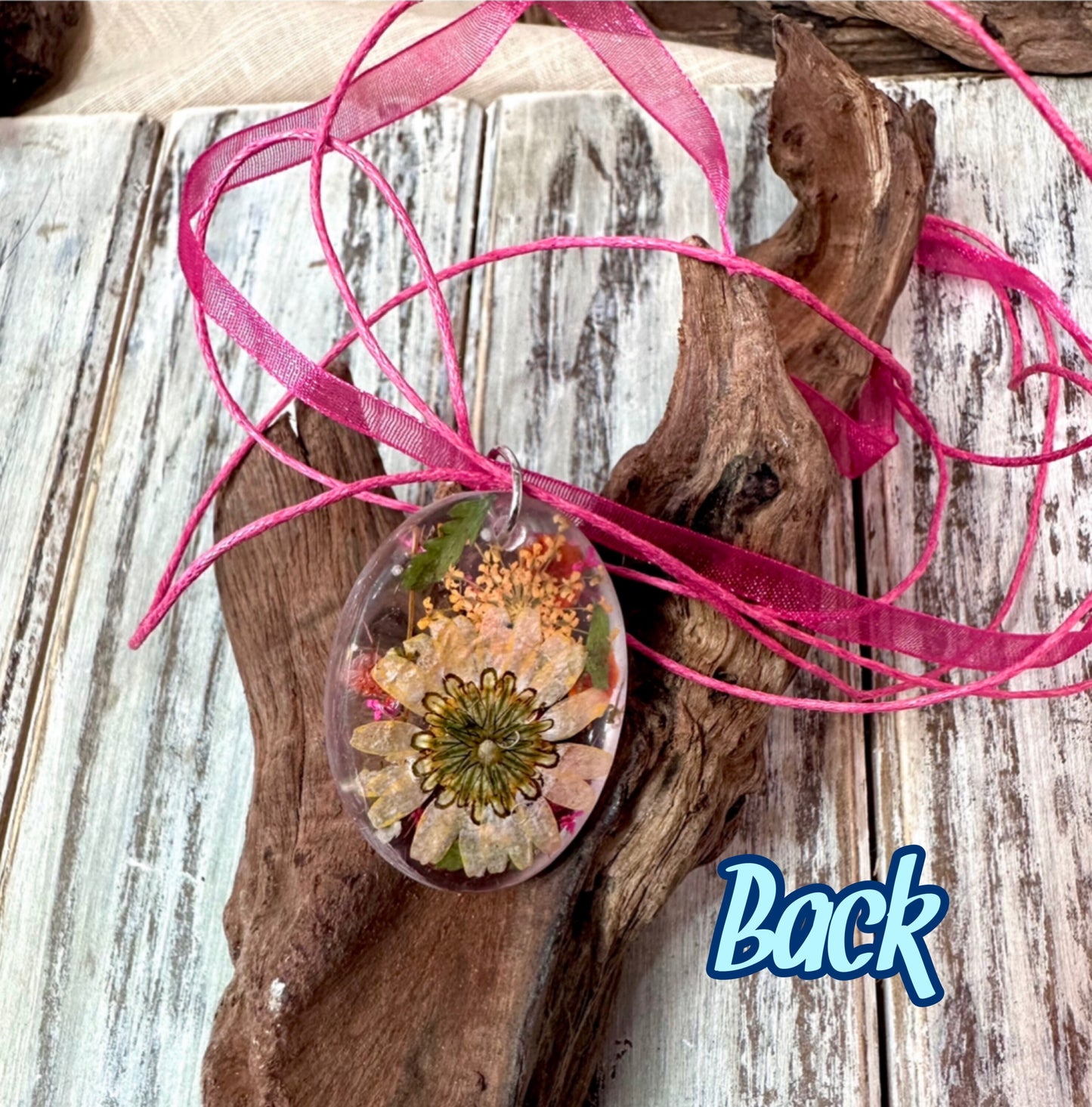 This is the first of my dried flower resin necklaces, and I am simply in love with it! The color combo better than I imagined it to be. It is bright and cheerful and it puts out a feeling of joy and happiness!