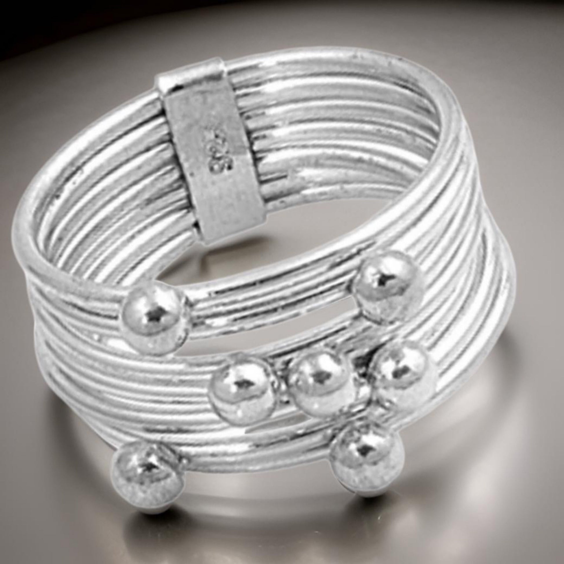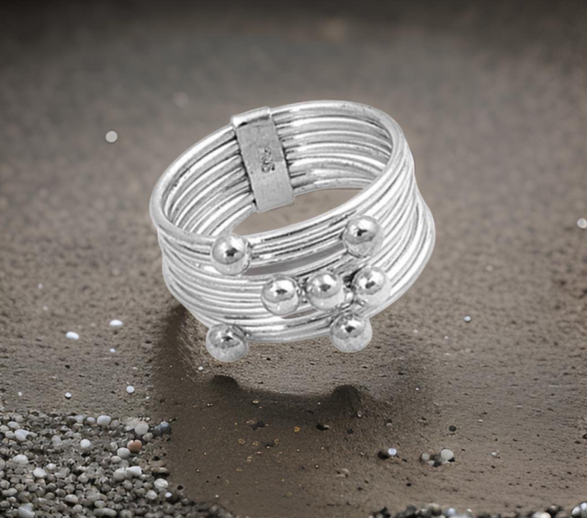This ring is a perfect combination of style, sass, and quality. It features 7 individual bands and 6 beads, totaling a width of 11mm (nearly a half inch), making it a statement piece that is sure to draw attention. The solid .925 Sterling Silver material used in the ring ensures durability and longevity, making it a great choice for those who want a piece of jewelry that will maintain its beauty and style for years to come.