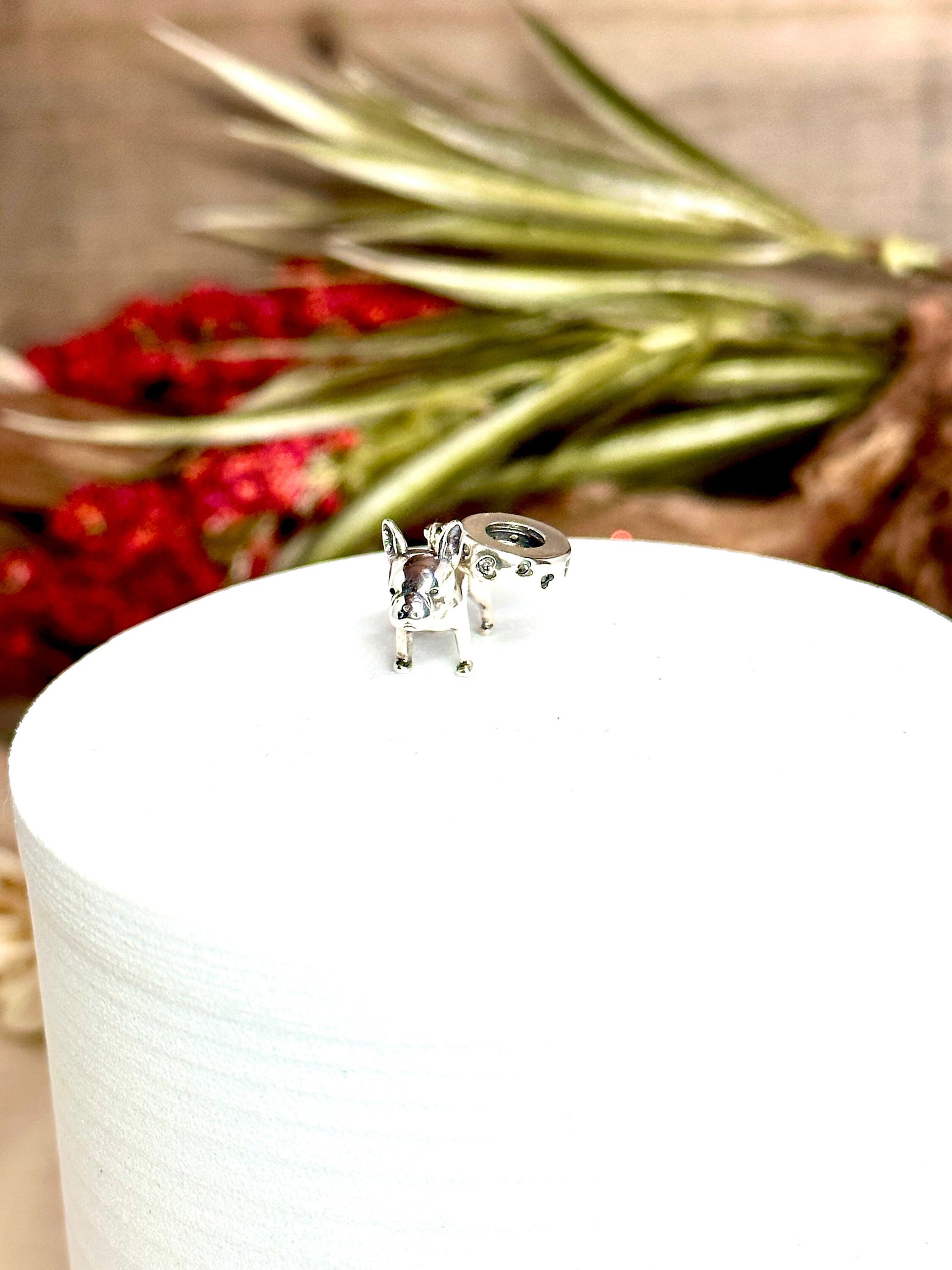 A beautiful full impression and double sided French Bulldog hanging from a decorative European Styleconnector bail with 1mm Zirconia embedded into tiny hearts